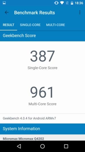 Qualcomm Snapdragon 210 — SoC совсем простенькая, приблизительно на уровне MediaTek MT6737 или даже еще чуть ниже. Соответственно, во всех тестах результаты невысоки: в комплексном AnTuTu платформа набирает не более 20К очков, а что касается графических тестов, то видеоускорителем не поддерживается OpenGL ES 3.1, а с тестами 3DMark смартфон вообще не справился.