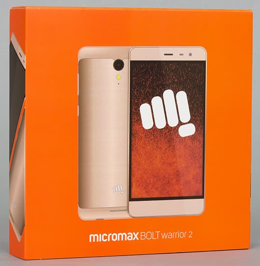 Micromax Bolt Warrior 2 поставляется в продажу в плоской коробке квадратной формы с твердой картонной суперобложкой. Оформление таково, что именно на этот съемный кожух наносятся все обозначения, логотипы и спецификации. Сама же коробка остается абсолютно чистой, вообще без каких-либо обозначений, поэтому она используется для разных моделей, меняются только обложки.