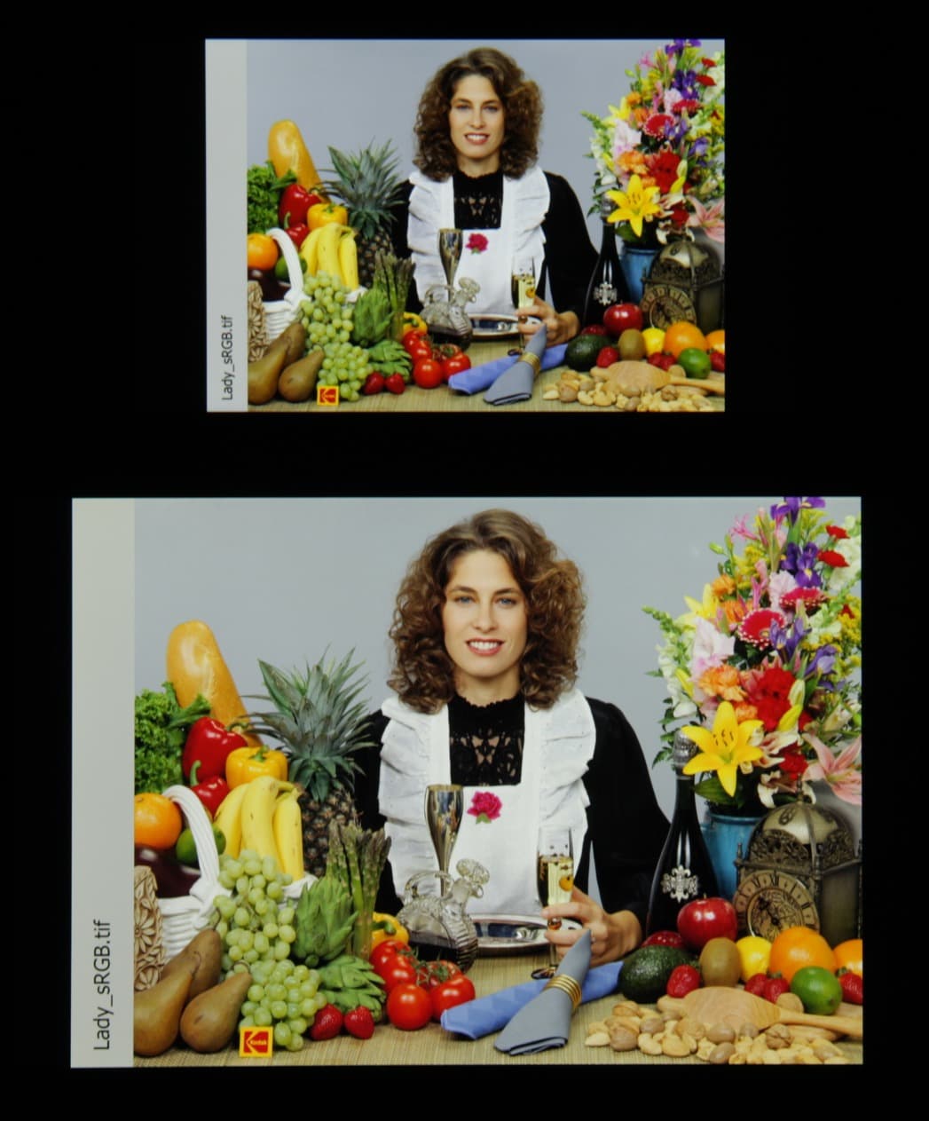В итоге цвета имеют естественную насыщенность. Баланс оттенков на шкале серого хороший, так как цветовая температура несильно выше стандартных 6500 К, и отклонение от спектра абсолютно черного тела (ΔE) меньше 10, что для потребительского устройства считается приемлемым показателем. При этом цветовая температура и ΔE мало изменяются от оттенка к оттенку — это положительно сказывается на визуальной оценке цветового баланса. (Самые темные области шкалы серого можно не учитывать, так как там баланс цветов не имеет большого значения, да и погрешность измерений цветовых характеристик на низкой яркости большая.)