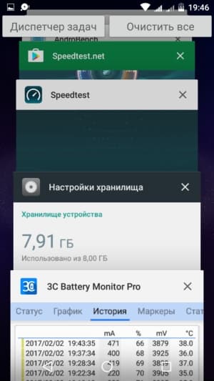 Беспрерывное чтение в программе Moon+ Reader (со стандартной, светлой темой) при минимальном комфортном уровне яркости (яркость была выставлена на 100 кд/м²) с автолистанием длилось до полного разряда аккумулятора 19 часов, а при беспрерывном просмотре видео в высоком качестве (720р) с тем же уровнем яркости через домашнюю сеть Wi-Fi аппарат функционирует около 14 часов. В режиме 3D-игр смартфон проработал 7 часов.