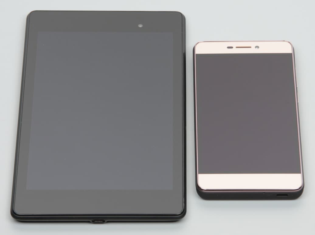 Лицевая поверхность экрана выполнена в виде стеклянной пластины с зеркально-гладкой поверхностью, устойчивой к появлению царапин. Судя по отражению объектов, антибликовые свойства экрана лучше, чем у экрана Google Nexus 7 (2013) (ниже просто Nexus 7). Для наглядности приведем фотографию, на которой в выключенных экранах отражается белая поверхность (слева — Nexus 7, справа — Micromax Canvas Juice A1, далее их можно различать по размеру):