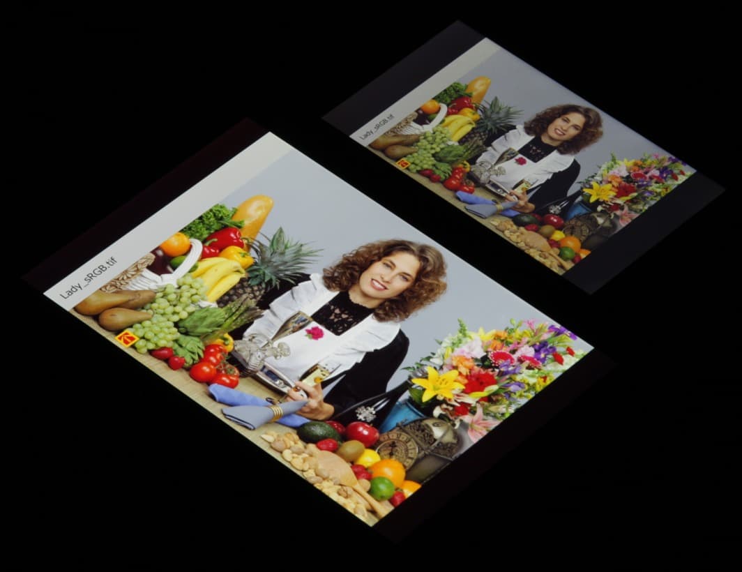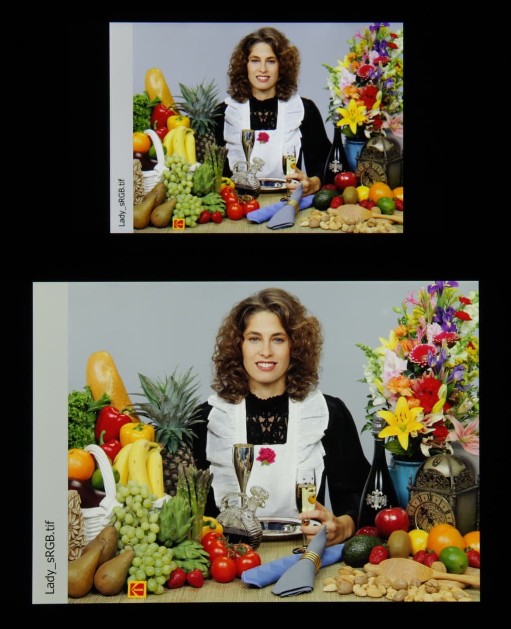 В итоге цвета имеют естественную насыщенность. Баланс оттенков на шкале серого приемлемый, так как цветовая температура существенно выше стандартных 6500 К, но отклонение от спектра абсолютно черного тела (ΔE) меньше 10, что для потребительского устройства считается приемлемым показателем. При этом цветовая температура и ΔE мало изменяются от оттенка к оттенку — это положительно сказывается на визуальной оценке цветового баланса. (Самые темные области шкалы серого можно не учитывать, так как там баланс цветов не имеет большого значения, да и погрешность измерений цветовых характеристик на низкой яркости большая.)