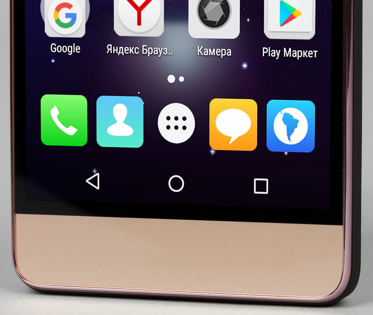 Передняя панель прикрыта плоским стеклом без покатых краев. Наверху имеется сенсор освещения, камера без вспышки, но, к сожалению, нет светодиодного индикатора событий. Нет и подсветки в нижней части, поскольку аппаратных кнопок там нет.