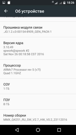 - SoC Qualcomm Snapdragon 210 (MSM8909), 4 ядра @1,1 ГГц (ARM Cortex-A7)