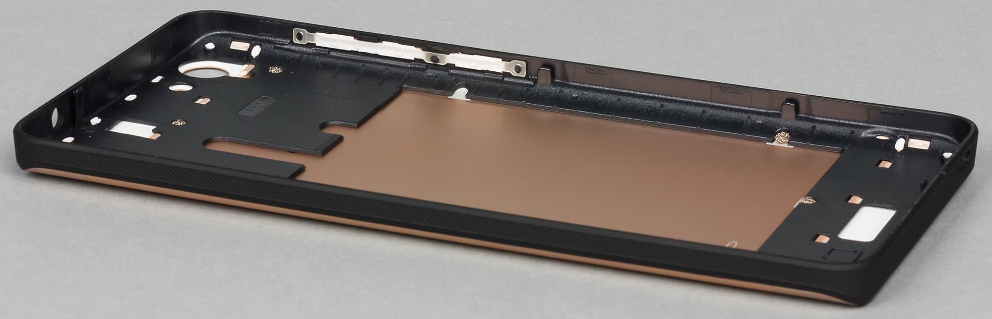 Корпус в целом не металлический, по большей части он состоит из пластмассы, из настоящего металла выполнена лишь центральная часть задней крышки: это тонкая пластина, впаянная в пластмассовый остов. Из пластика же выполнены все боковины, торцевые части, а также верхняя с нижней тыльные вставки.