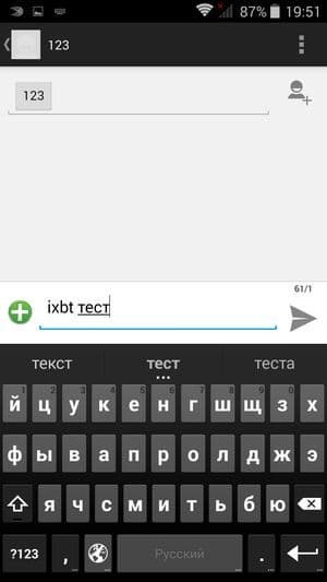 Самопроизвольных перезагрузок/выключений за время тестирования не наблюдалось, с этим проблем нет, интерфейс работает очень быстро, задержек и заторможенности не замечено. Раскладка и расположение клавиш стандартные: переключение языков осуществляется нажатием на специальную кнопку с изображением глобуса, отдельного выделенного ряда с цифрами нет — необходимо каждый раз переключать раскладку. Телефонное приложение поддерживает Smart Dial, то есть во время набора телефонного номера сразу осуществляется и поиск по контактам, а вот любимого многими пользователями безотрывного способа ввода типа Swype здесь нет. Однако, предустановленная альтернативная программа SwiftKey восполняет этот пробел.
