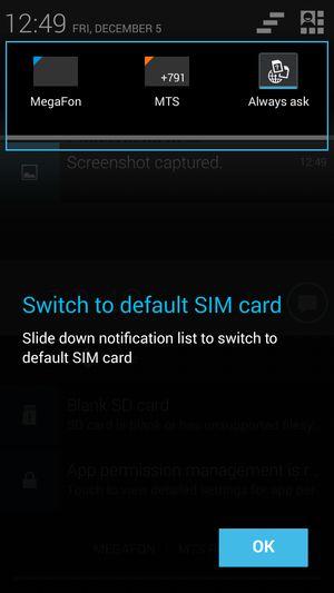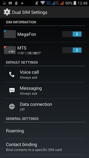 Смартфон поддерживает работу с двумя SIM-картами, и в целом работа с ними в меню организована по знакомому принципу: можно любую из SIM-карт назначить основной для организации голосовых звонков, передачи данных или отправки SMS-сообщений; при наборе номера также можно выбрать желаемую карту в контекстном подменю. С сетями 3G может работать SIM-карта в любом слоте, однако одновременно в этом режиме может функционировать лишь одна из карт. Для смены назначений слотов карточки менять местами не требуется — это можно сделать прямо из меню телефона. Работа с двумя SIM-картами организована по привычному стандарту Dual SIM Dual Standby, когда обе карты могут находиться в активном режиме ожидания, но одновременно работать не могут — радиомодуль здесь только один.