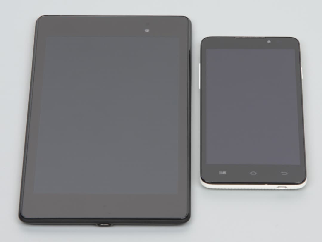 Лицевая поверхность экрана выполнена в виде стеклянной пластины с зеркально-гладкой поверхностью, устойчивой к появлению царапин. Судя по отражению объектов антибликовые свойства экрана не хуже, чем у экрана Google Nexus 7 (2013) (далее просто Nexus 7). Для наглядности приведем фотографию, на которой в выключенных экранах отражается белая поверхность (слева — Nexus 7, справа — Micromax Canvas Nitro, далее их можно различать по размеру):