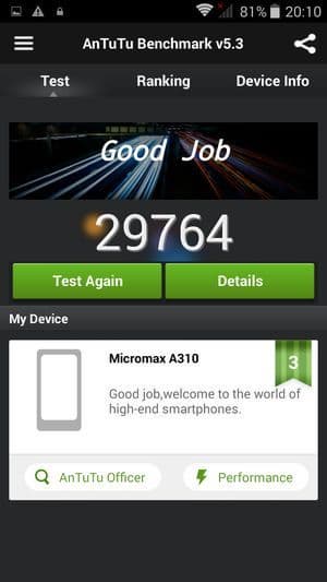По результатам тестирования Micromax Canvas Nitro не оказался снабжен всеми необходимыми декодерами, которые нужны для полноценного проигрывания большинства наиболее распространенных в сети мультимедийных файлов. Для успешного их проигрывания придется прибегнуть к помощи стороннего проигрывателя — к примеру, MX Player. Правда, и в нем необходимо изменять настройки и устанавливать дополнительные пользовательские кодеки, ведь теперь данный плеер официально не поддерживает звуковой формат АС3.