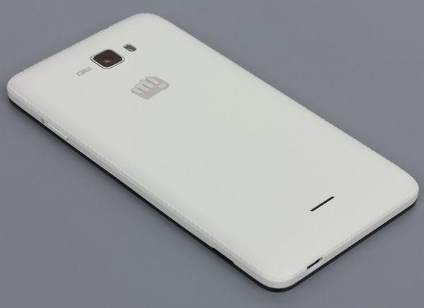 На тыльной поверхности смартфона можно обнаружить квадратное окошко камеры, обрамленное металлическим ободком, а также глазок одиночной светодиодной вспышки (штатной программы-фонарика для нее в смартфоне не обнаружилось). Ниже расположена решетка для выхода звука из динамика, выполненная в виде обычной продольной щели. Динамик здесь один, расположен он сзади, так что и звук идет в обратную сторону от пользователя. Никаких выступов около решетки не предусмотрено, звук приглушается поверхностью, когда смартфон лежит на столе экраном вверх.
