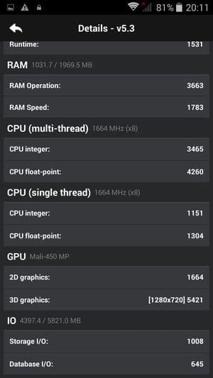 По результатам тестирования платформа показала весьма неплохие результаты, производительность у смартфона выше среднего (примерно 30К в AnTuTu v 5.x). Добавить здесь особенно нечего, восьмиядерная SoC MediaTek MT6592 уже давно и прочно обосновалась на рынке, она хорошо уже нами изучена на примере множества аппаратов, протестированных за прошедший год. Рекордов по производительности она никогда не била и уже не побьет, но и смартфоны на ее основе не слишком дороги. На смену ей постепенно будет приходить новая MT6595, некоторые из таких устройств мы уже исследовали. Новая платформа превосходит свою предшественницу столь значительно, что сравнивать их просто бессмысленно. Удел SoC MediaTek MT6592 — средний и дальше по нисходящей уровни, но никак не топовый и не флагманский. Тем не менее, описываемый сегодня смартфон достаточно мощный, производительности восьмиядерной платформы еще долго будет хватать для выполнения большинства задач.
