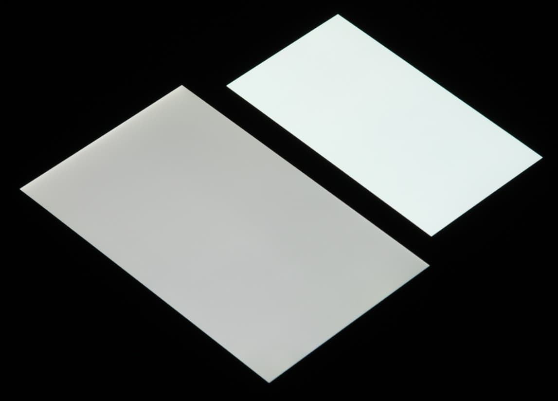 Экран характеризуется великолепными углами обзора, правда белый цвет при отклонении даже на небольшие углы приобретает легкий сине-зеленый или розоватый оттенок, но черный цвет — просто черный под любыми углами. Настолько черный, что параметр контрастности в данном случае просто неприменим. Для сравнения приведем фотографии, на которых на экраны Microsoft Lumia 950 XL (профиль Стандартный) и второго участника сравнения выведены одинаковые изображения, при этом яркость экранов изначально установлена примерно на 200 кд/м², а цветовой баланс на фотоаппарате принудительно переключен на 6500 К. Белое поле: