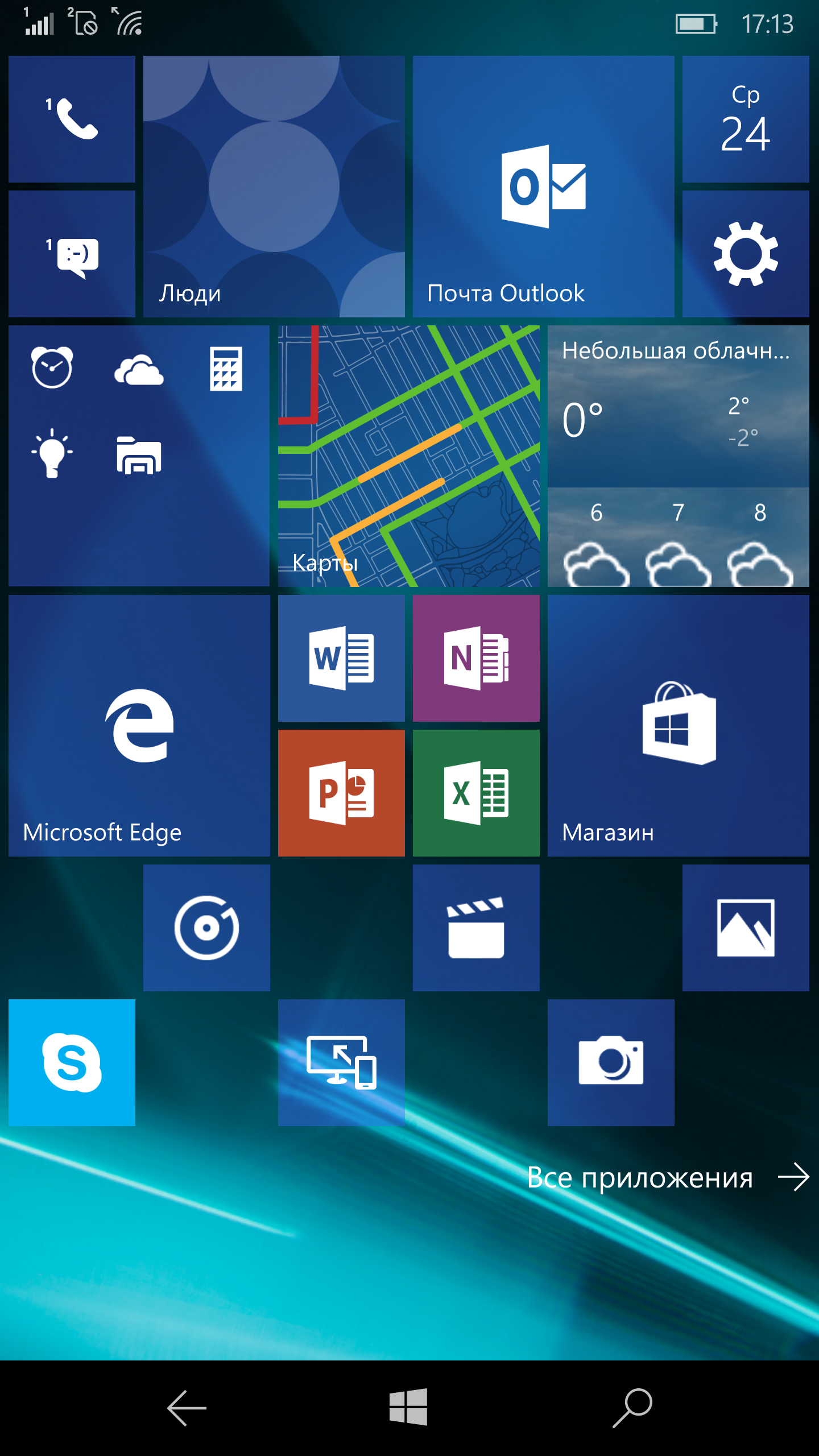 При необходимости в режиме Continuum можно иметь доступ и к интерфейсу мобильной операционной системы, например, для изменения настроек. Однако приложения могут работать или на смартфоне или на большом экране. Одновременно запустить две их копии невозможно. Кроме того, программа должна иметь поддержку Continuum. На момент проведения тестирования, подавляющее число встроенных приложений работало на большом экране (включая браузер, почту, офис, карты и другие). Заметное исключение составил только Skype. Кроме того, не все функции программ могут быть доступны в таком режиме. Например, можно запустить программу для телефонных звонков, но собственно позвонить из нее будет невозможно, а входящий вызов придет на смартфон.
