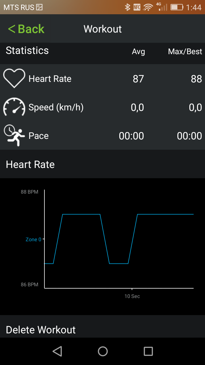 После тренировки можно загрузить статистику о пульсе, скорости и дистанции (если это был бег, ходьба и т.п.). К сожалению, в бассейне браслет работает некорректно: постоянно сбивается считывание пульса, отображает какие-то непонятные цифры, не относящиеся к тренировке, неверно интерпретирует полученные результаты. Что касается использования в качестве обычного фитнес-трекера, то здесь мы тоже были очень удивлены: после синхронизации браслета и смартфона в приложении все равно отображаются нули — как будто за день ношения браслета мы не сделали ни одного шага. Скорее всего, это проблемы совместимости с конкретной версией ОС и прошивкой смартфона, и мы не сомневаемся в том, что такие простейшие вещи это устройство на самом деле умеет делать (в конце концов, на экране самого браслета же количество шагов, дистанция и прочее отображается корректно), но умолчать об этом факте тоже не можем.