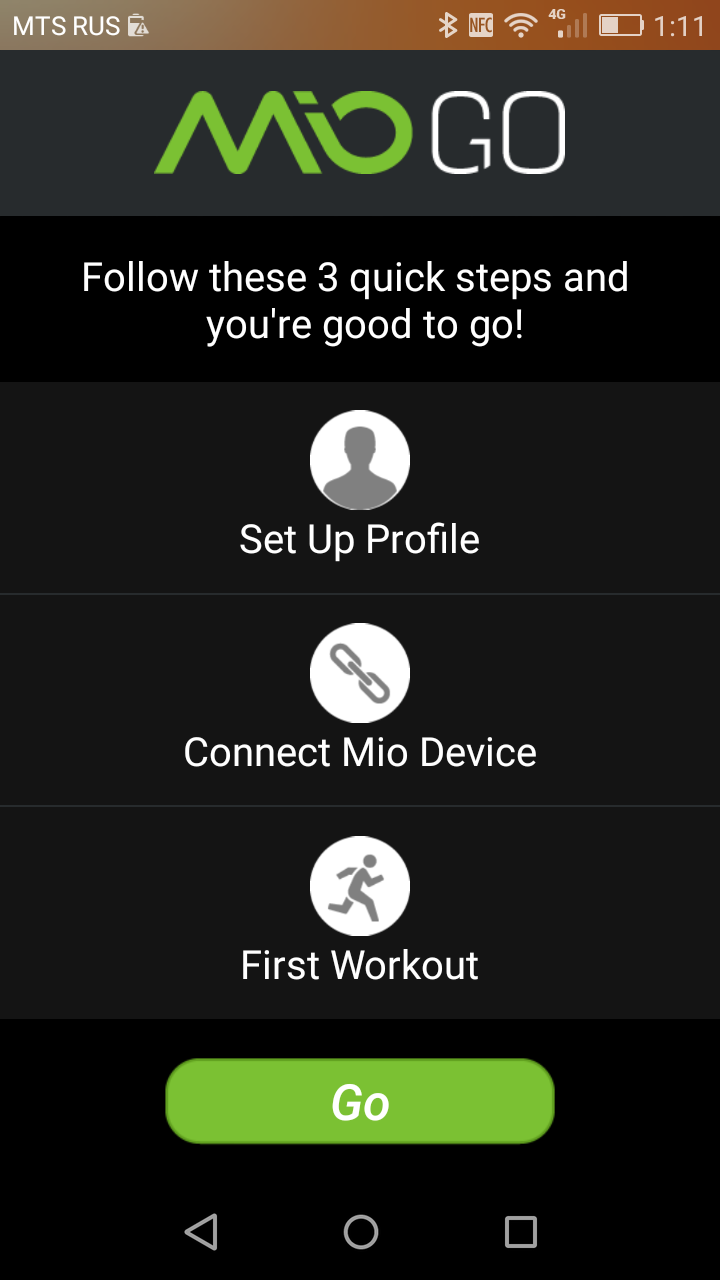 Для работы с трекером необходимо установить приложение Mio Go. Мы тестировали устройство с Huawei P8 Lite на базе Android 5.0. С iPhone 6, на котором установлена бета-версия iOS 9, приложение было неработоспособно. Забегая вперед, отметим, что и Android-версия нас не во всем удовлетворила. Но она хотя бы работала.