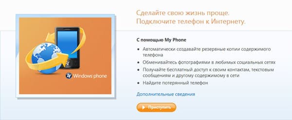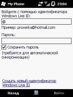 Не меньшим плюсом является и то, что в устройствах на базе Windows Mobile 6.5 My Phone уже установлен. Чтобы его запустить, надо зайти в меню Пуск (его можно запустить нажатием на клавишу Windows, которая должна быть, если модель телефона соответствует стандартам Windows Phone). В меню Пуск выбираем иконку My Phone, далее вам будет предложено принять всякие лицензионные соглашения / предупреждения, после чего — можно вводить Windows Live ID.