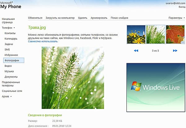 Что же мы видим на нашей странице? Слева — список того, что может быть синхронизоровано, в центре — содержимое выбранной папки синхронизации (на приведенном скриншоте — фотография с мобильного телефона), справа баннер Windows Live (вероятно, в будущем Microsoft будет продавать здесь рекламу), а над ним — галерея миниатюр синхронизированных фотографий. Все понятно и удобно. Фотографию, кстати, можно опубликовать в одной из социальных сетей (Facebook, Flickr или MySpace) или в галерее на Windows Live.