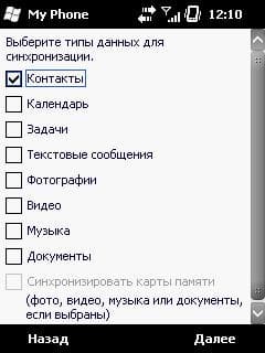 Следующий шаг — настройка синхронизации. Здесь вы можете выбрать, какие данные и типы файлов вы хотите синхронизировать. В отличие от MobileMe, можно синхронизировать SMS-сообщения. Но нельзя — почту. И это — очень большой минус. ОК, жмем Далее — и My Phone предлагает обновиться (хотя телефон Rover S8, на котором проводилось тестирование, сравнительно новый). Никакой информации о том, что за обновление и зачем оно нужно, я не увидел. Но что ж делать, обновляемся.