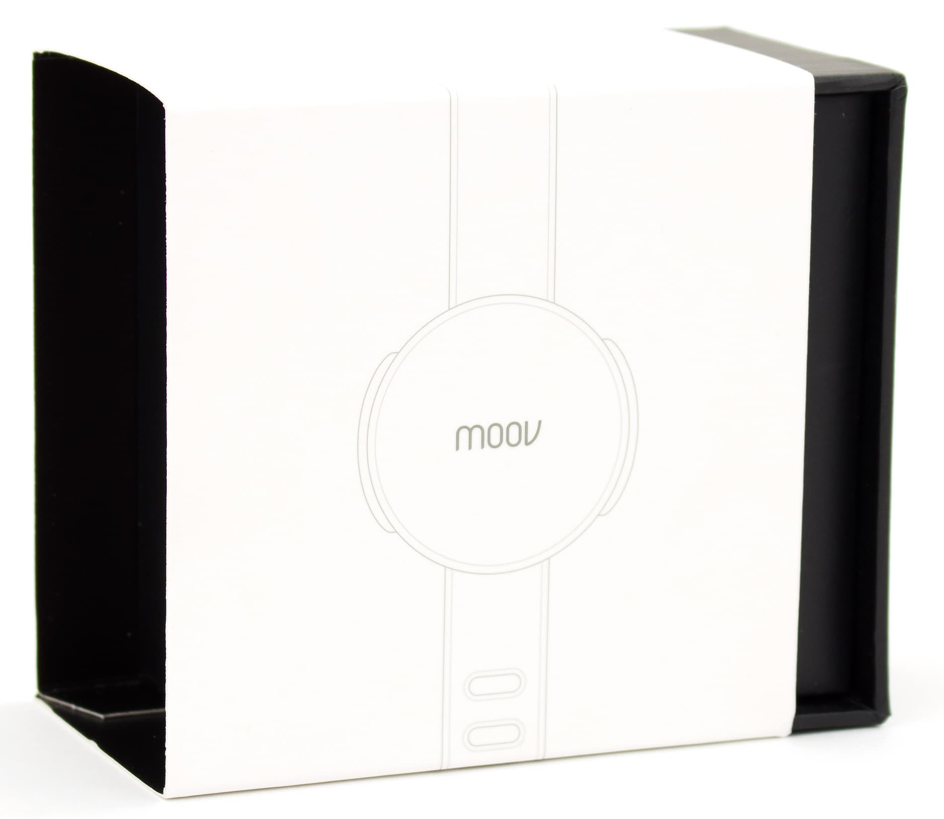 Гаджет поставляется в прямоугольной коробке из плотного картона. Сама коробка черная, сверху на ней — белая суперобложка с условным контурным изображением Moov.