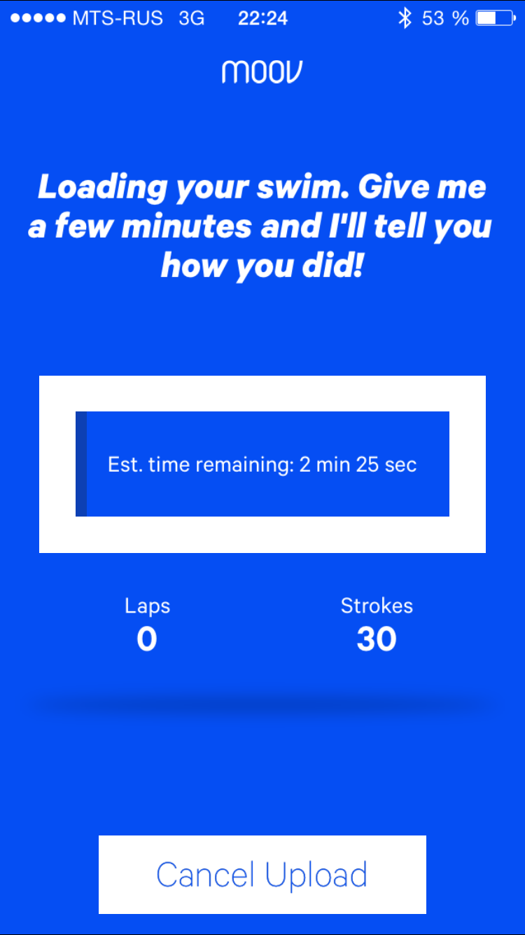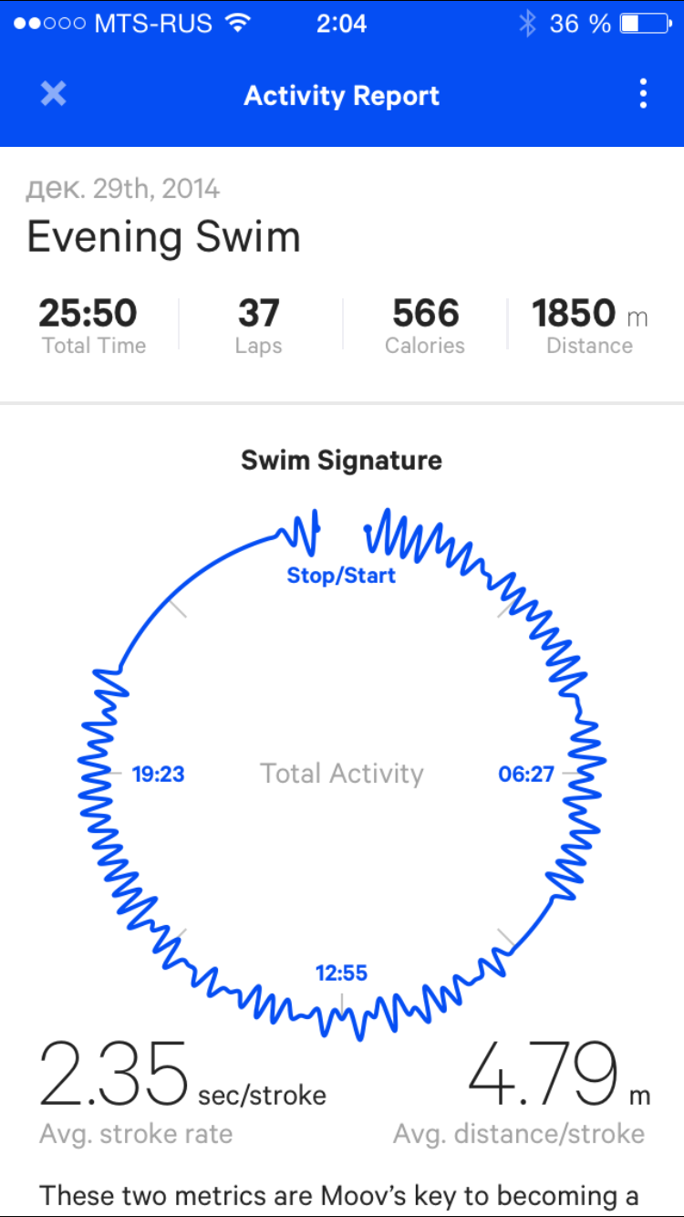 Мы протестировали приложение «в боевых условиях», то есть в обычном городском бассейне. Итак, после переодевания в плавки закрепляем браслет на руке (все равно, на какой), включаем приложение и нажимаем большую кнопку Rec. Убираем смартфон в шкафчик — и вперед. Короткий душ, затем погружение в бассейн. Плаваем примерно 25 минут от бортика к бортику с несколькими кратковременными передышками, далее выходим, принимаем душ, расслабляясь и не особо заботясь о времени, вытираемся и выходим в раздевалку. Достаем смартфон из шкафчика, выводим его из ждущего режима и жмем Stop swimming в открытом приложении. После этого видим, как Moov начинает загружать в смартфон данные, полученные во время плавания.