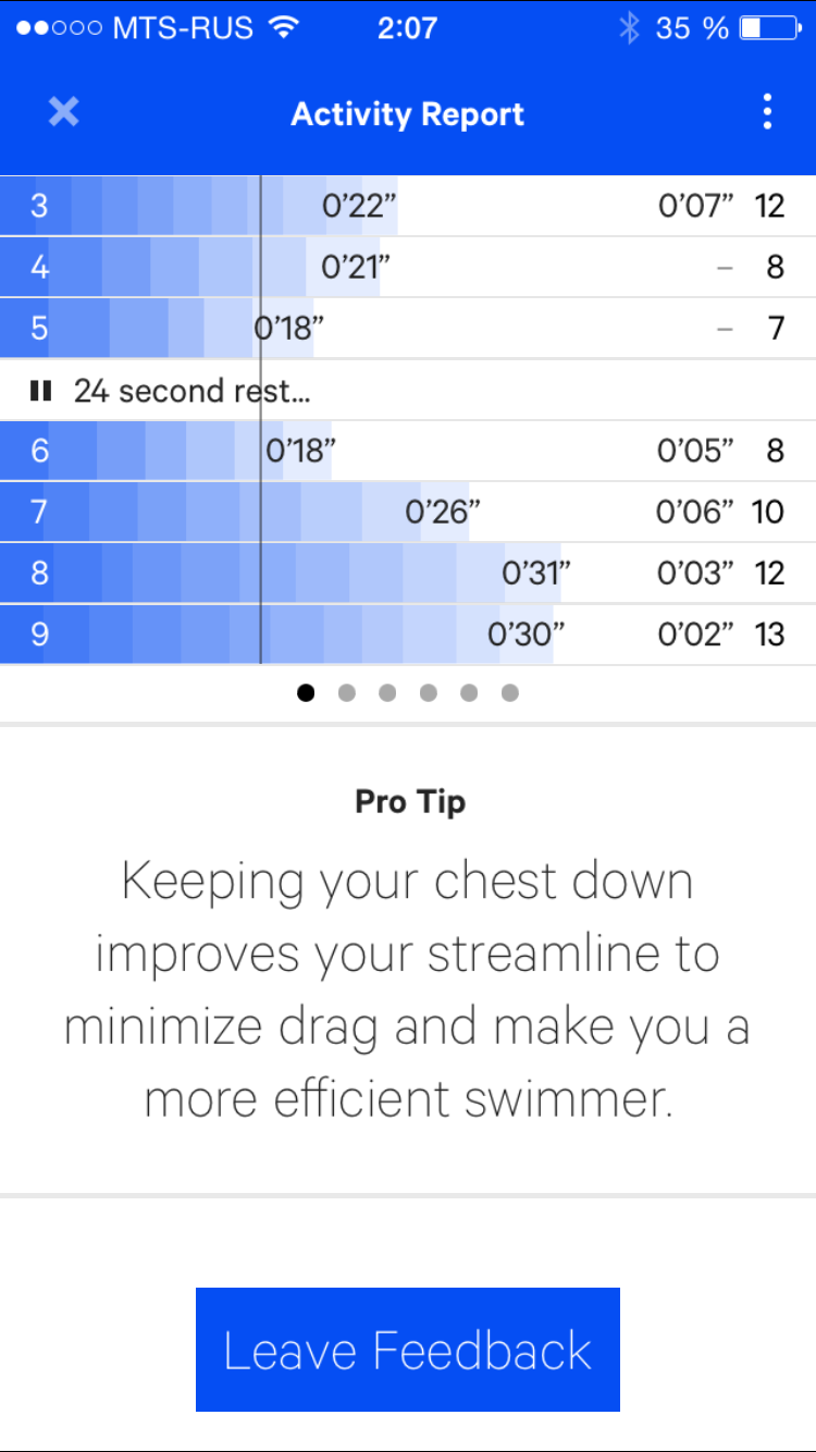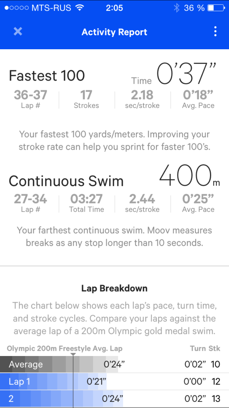 Также в отчете указываются все подробности о самом быстром заплыве и самом длинном непрерывном заплыве, даются советы, как улучшить свою технику, и даже предлагают для сравнения результаты олимпийских чемпионов (при этом, надо учитывать, что результат дается для 200-метровой дистанции, поэтому не спешите радоваться, что у вас заплыв на 50 метров получился на две секунды быстрее:)).
