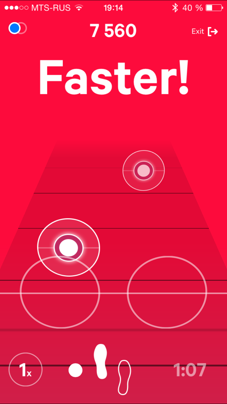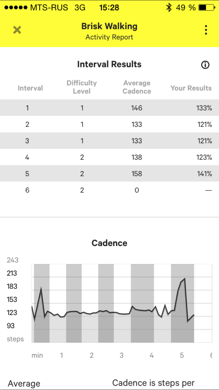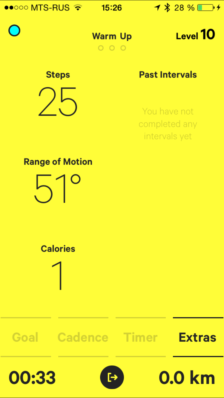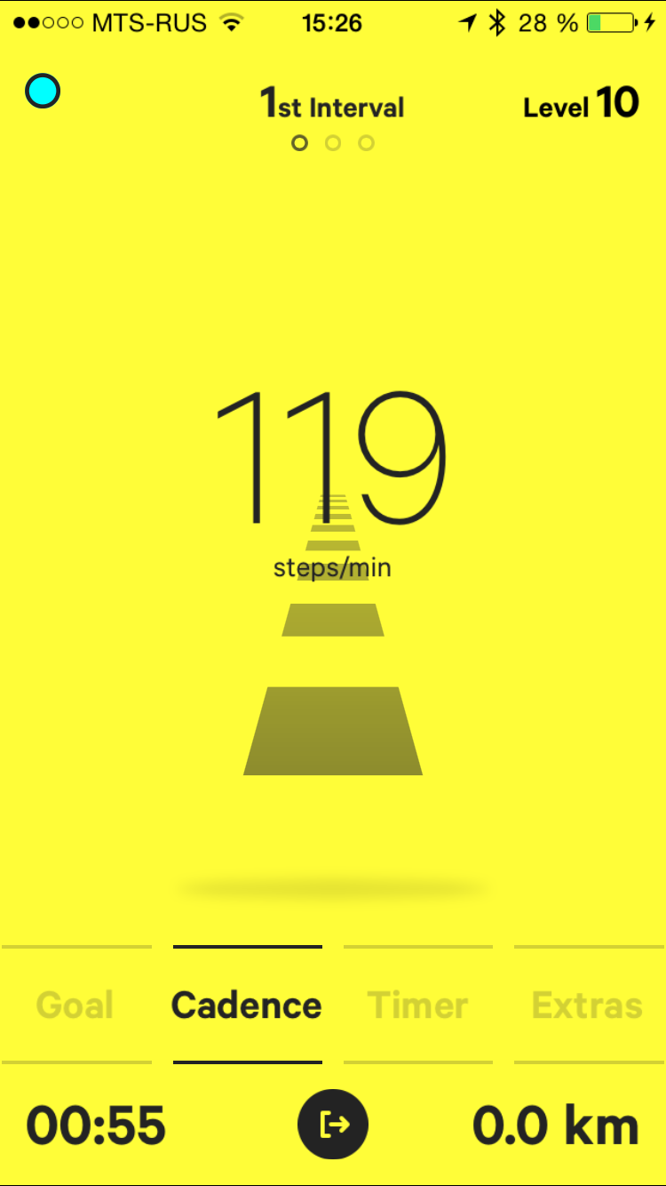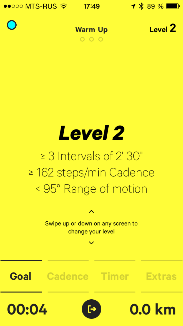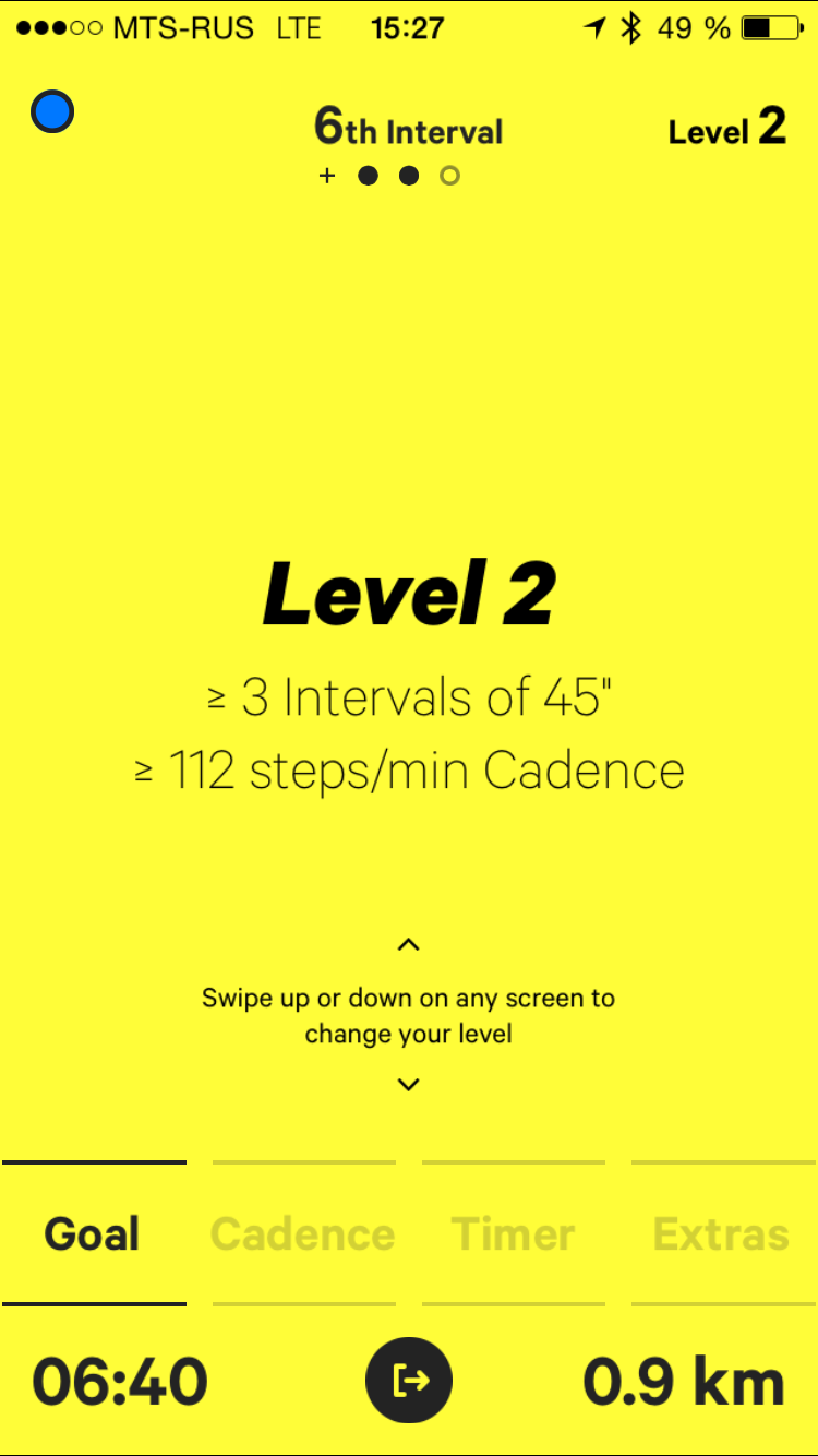 Итак, закрепив браслет на ноге и выбрав нужный режим, начинаем тренировку. Есть и минус: бегать придется со смартфоном и, скорее всего, в наушниках (если не хотите, чтобы окружающие слышали команды, которые дает вам приложение). Переключение между уровнями сложности выполняется свайпом. При этом, разница между соседними уровнями довольно небольшая, но повышение уровня на три-четыре уже весьма ощутимо. Так, в случае с ходьбой на максимальном 21 уровне надо пройти три интервала по 5 минут 30 секунд, и каждый интервал надо преодолевать со скоростью 150 шагов в минуту (то есть два с половиной шага в секунду).