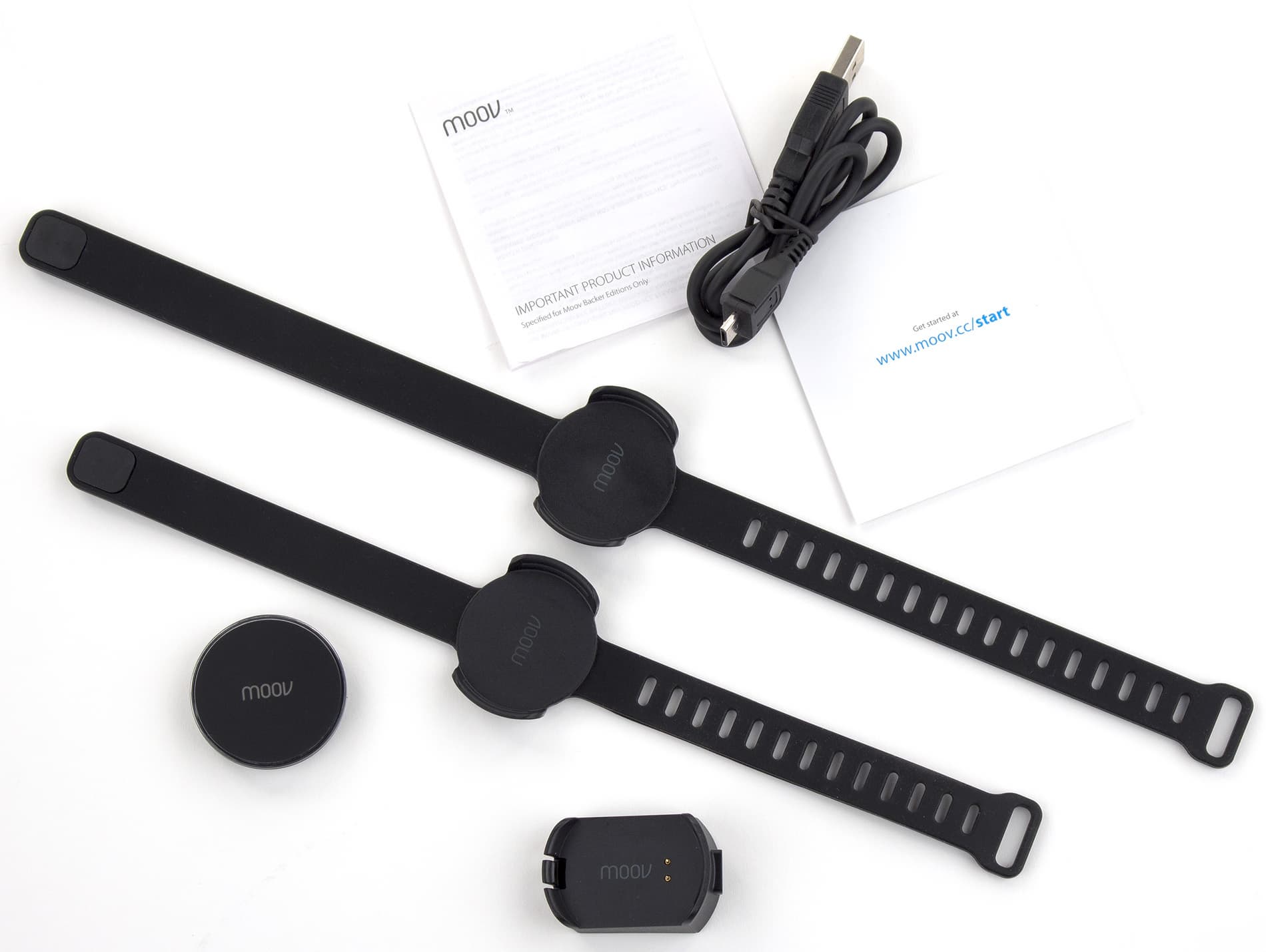 Внутри бокса разместились, помимо Moov, кабель USB — Micro-USB, две малоинформативные листовки, два браслета разных размеров, а также зарядный крэдл.