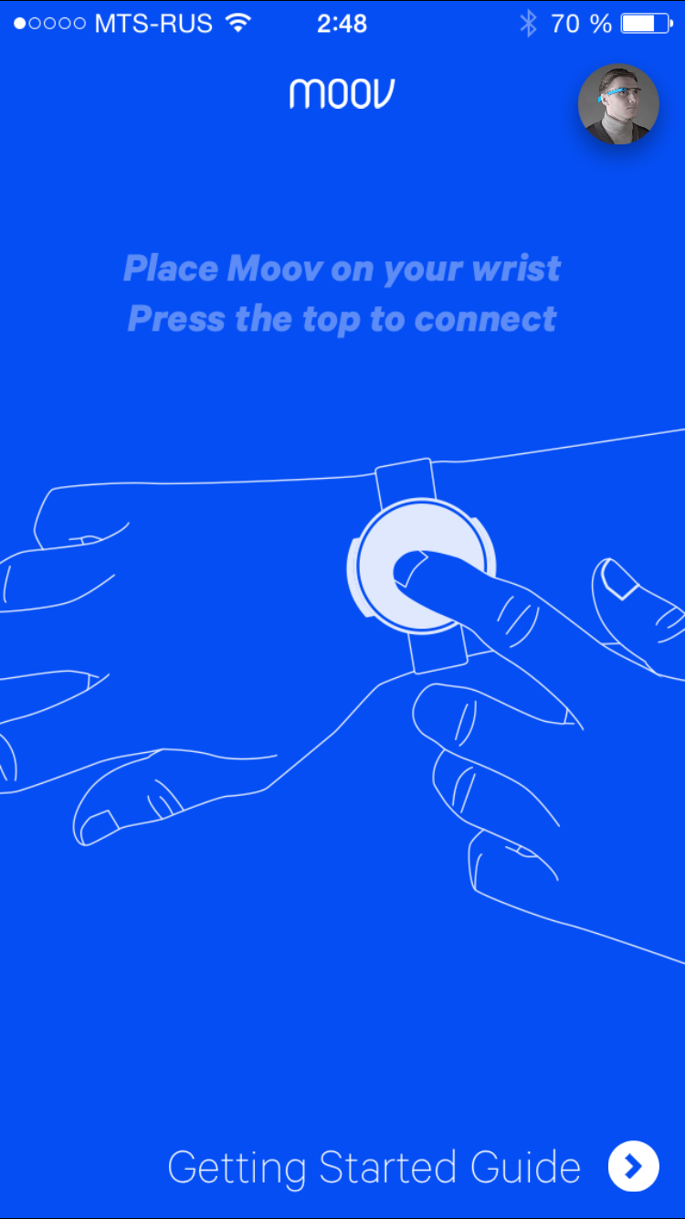 Для начала работы с устройством вы можете выбрать любое из доступных приложений. Разумеется, приложения полностью бесплатны. Запустив приложение, мы можем создать аккаунт или войти через Facebook (самый простой вариант). При этом, нам надо будет указать свой рост, вес и возраст, а также присвоить Moov имя и цвет индикации. Эта короткая первоначальная настройка требуется только при первом запуске любого из приложений. Затем вы можете запускать любое приложение — и для начала работы достаточно будет нажать на Moov и выбрать его в появившемся окне (если у вас несколько Moov, там будут отображаться все активные устройства).