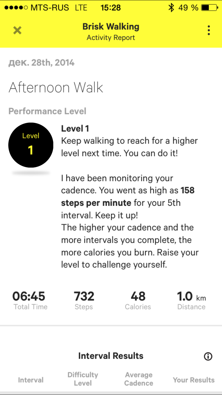 Во время движения женский голос сообщает вам, надо ли ускорить шаг и когда можно перейти на обычный шаг (между тремя интервалами есть тридцатисекундные перерывы). Например, если вы идете медленнее запланированного, голос говорит, что вы делаете 110 шагов в минуту, а надо минимум 115 шагов. Если вы останавливаетесь, голос убеждает вас продолжить движение. При длительной паузе сообщает, что движение прервано. Если вы идете быстрее, чем надо, голос сообщает об этом и рекомендует более высокий уровень.