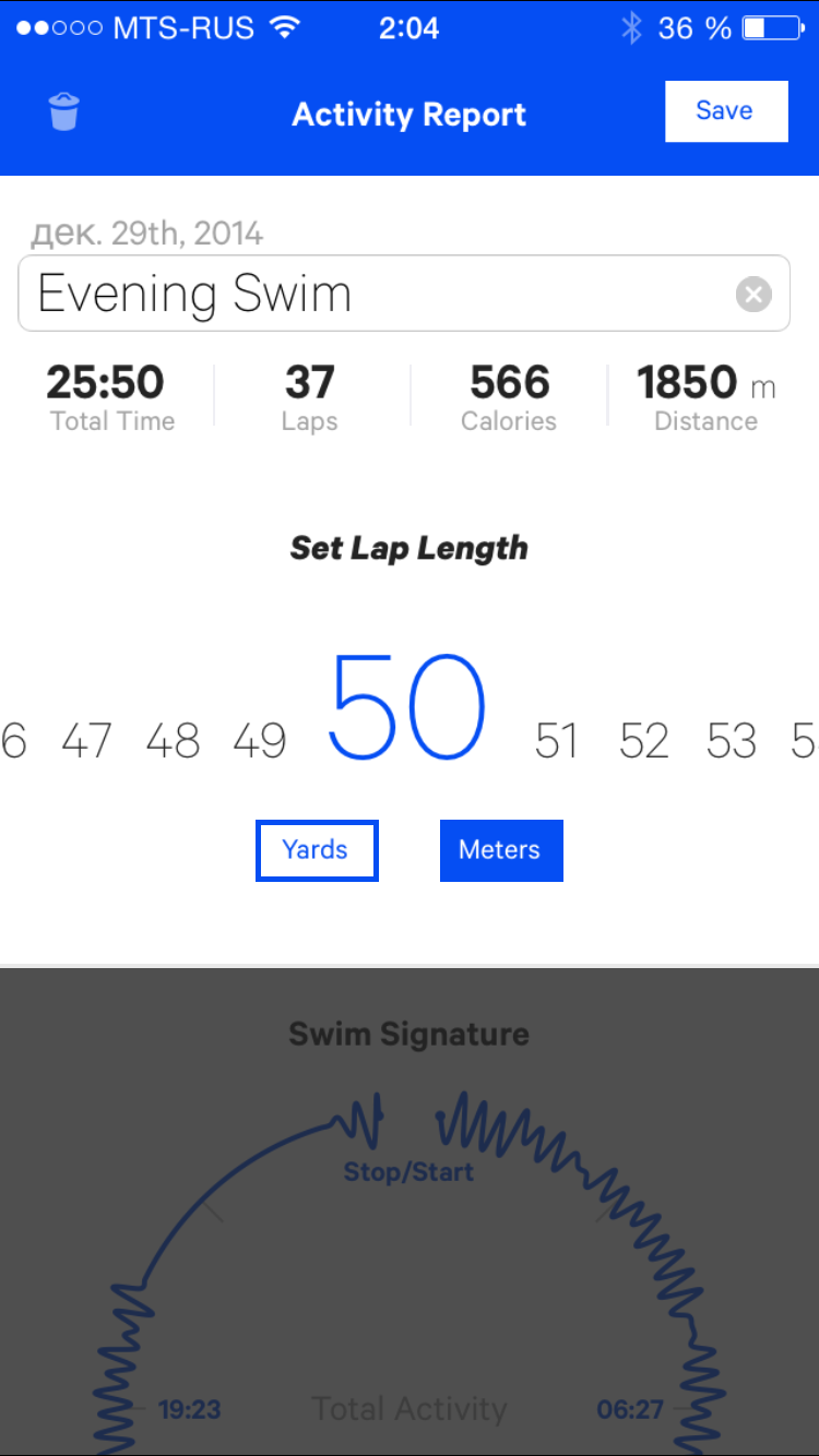 Главная радость — что браслет правильно определил то время, когда я плавал, не прибавив к нему время, проведенное в душевой. Жалко только, что Moov не может самостоятельно определить длину дорожки бассейна и при составлении отчета требует указать этот параметр (в метрах или ярдах). Очевидно, если бы здесь был GPS, то такой проблемы бы не оказалось. При этом, количество проплытых дорожек он определяет в любом случае правильно. Но если вы укажете неверную длину дорожки, то Moov неправильно посчитает суммарное расстояние и калории. К счастью, если вы ошиблись при первом составлении отчета, потом это можно исправить — данные будут пересчитаны автоматически.