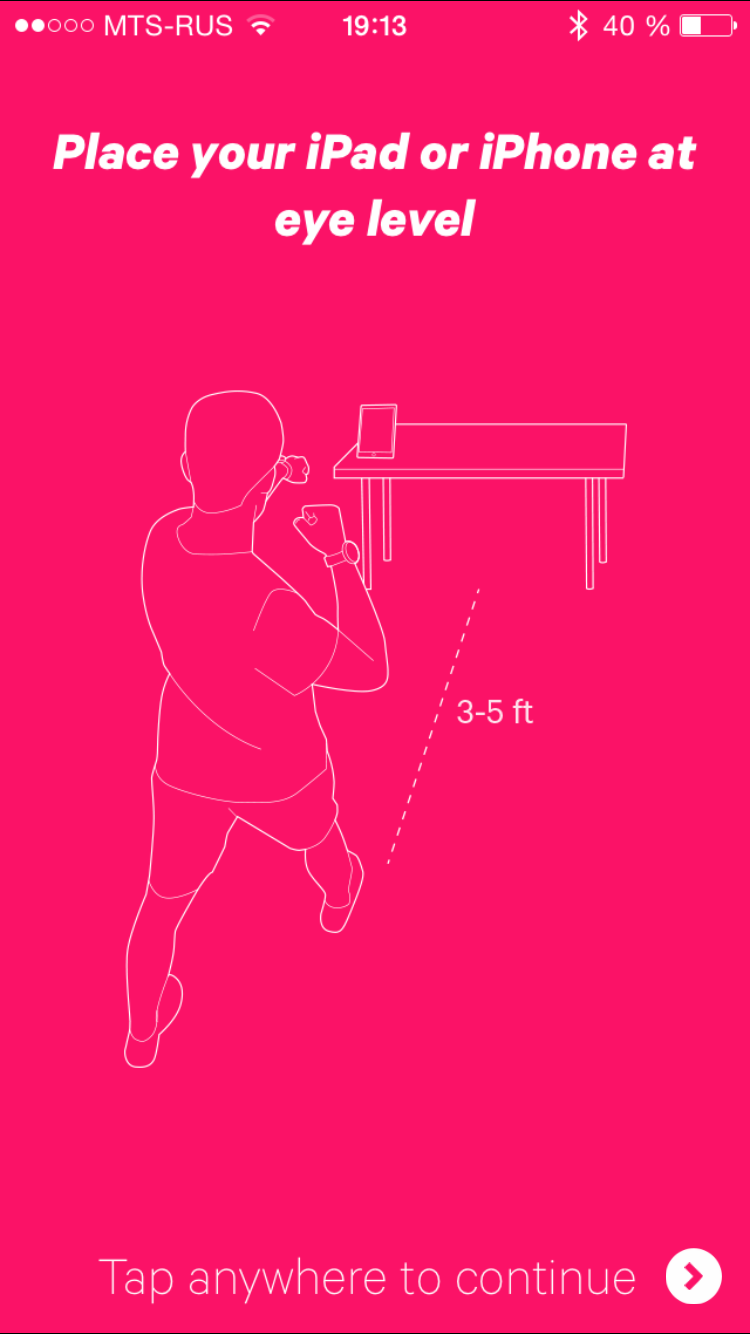 Прежде всего, вам предлагается посмотреть видео, где будет наглядно показано, какие бывают удары, как надо ставить ноги и т.п. После просмотра видео вы можете выбрать один из трех режимов: легкий (для новичков), полупрофессиональный и «чемпион». После выбора режима можно приступать к тренировке. Здесь уже вам не понадобятся наушники, но потребуется разместить смартфон где-то на уровне глаз, чтобы экран был постоянно в поле зрения. Конечно, удобнее, если это будет iPad, но, увы, отдельного приложения для iPad нет — вместо этого просто предлагается запустить смартфонное приложение с двукратным увеличением. Впрочем, если поставить планшет на некотором расстоянии от глаз, то дефекты изображения не очень будут бросаться в глаза.