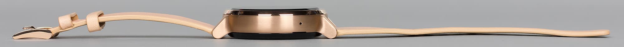 Ремешок часов выполнен из тонкой мягкой кожи. Сообщается, что это натуральная кожа фирмы Horween. Цвет — светло-бежевый. С золотистым цветом корпуса он неплохо гармонирует. Кожа ремешка немного напоминает по своим свойствам ремешок из гладкой кожи «гранада» для Apple Watch, однако застежка здесь обычная, традиционная, да и сама кожа, видимо, менее тщательно выделана — на экземпляре, который был у нас на тестировании, можно заметить сгибы и «морщинки», хотя понятно, что часы были в использовании относительно недолго.