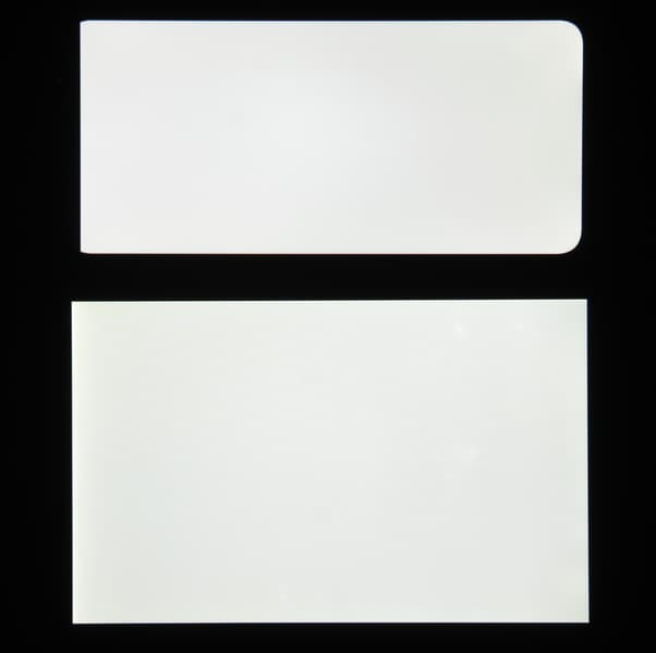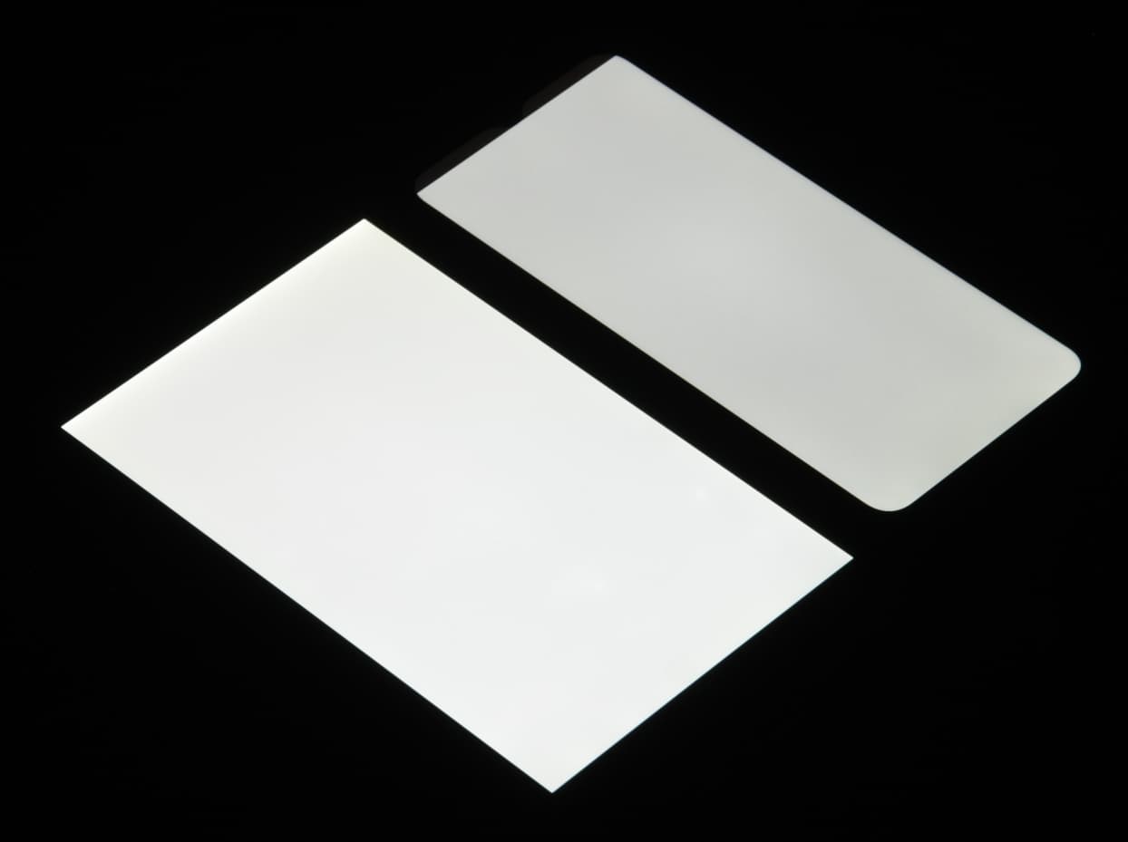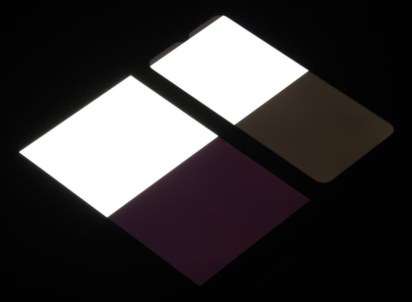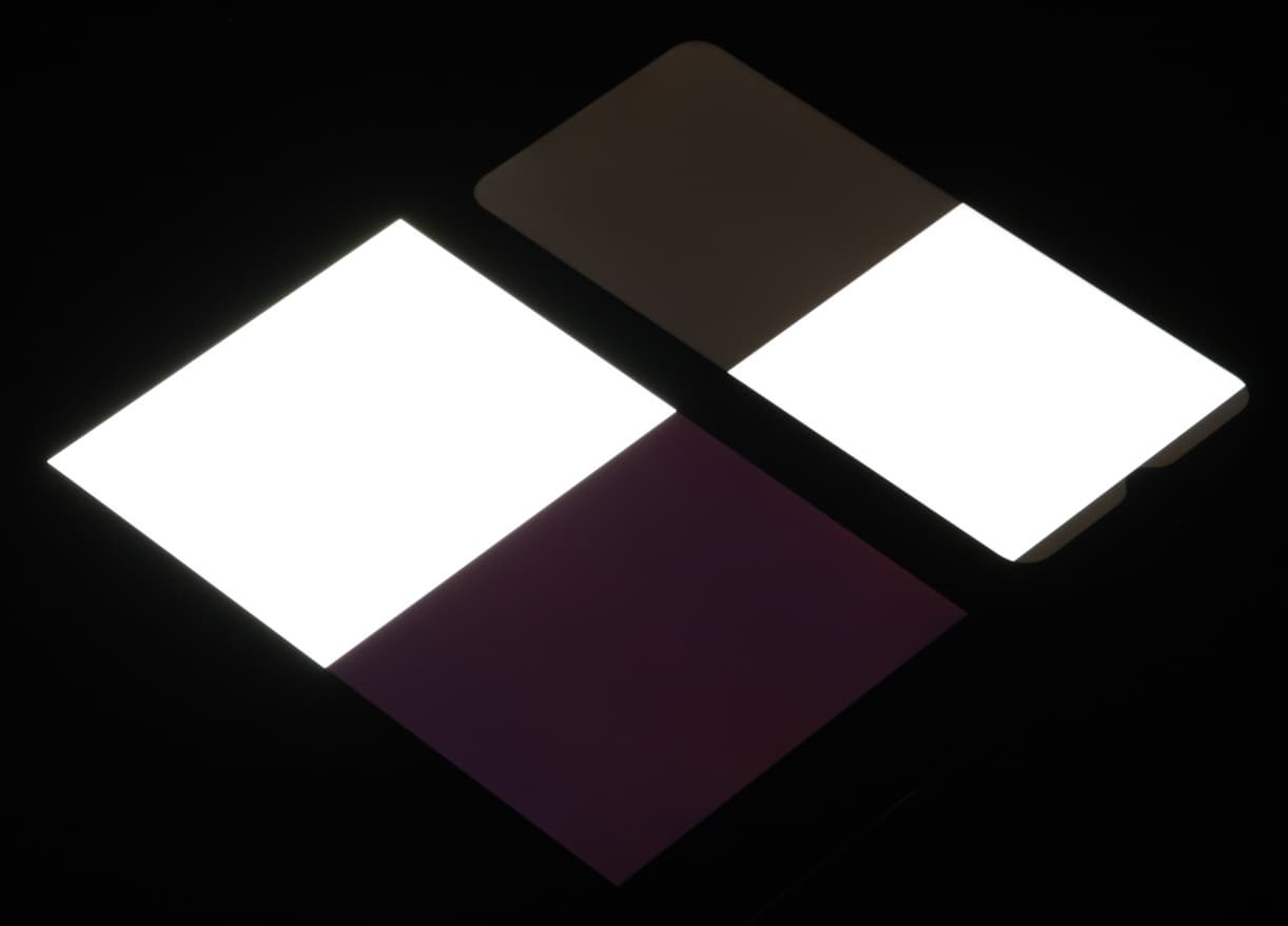Яркость под углом у экранов уменьшилась (как минимум в 5 раз, исходя из разницы в выдержке), но у смартфона яркость снизилась существенно больше. Черное поле при отклонении по диагонали сильно высветляется, но остается условно нейтрально-серым. Фотографии ниже это демонстрируют (яркость белых участков в перпендикулярном плоскости экранов направлении одинаковая!):