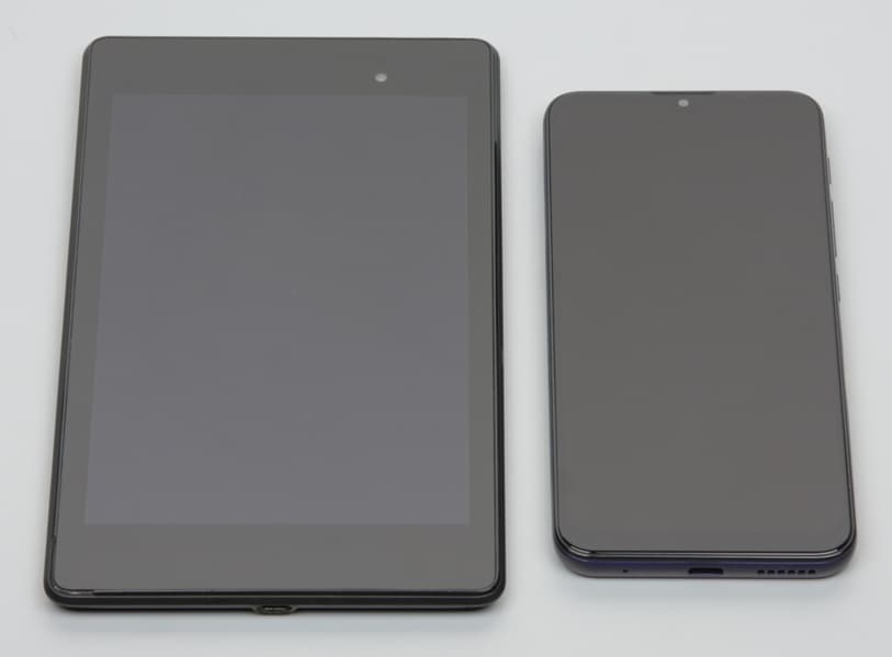 Лицевая поверхность экрана выполнена в виде стеклянной пластины с зеркально-гладкой поверхностью, устойчивой к появлению царапин. Судя по отражению объектов, антибликовые свойства экрана лучше, чем у экрана Google Nexus 7 (2013) (далее просто Nexus 7). Для наглядности приведем фотографию, на которой в выключенных экранах отражается белая поверхность (слева — Nexus 7, справа — Moto G9 Play, далее их можно различать по размеру):