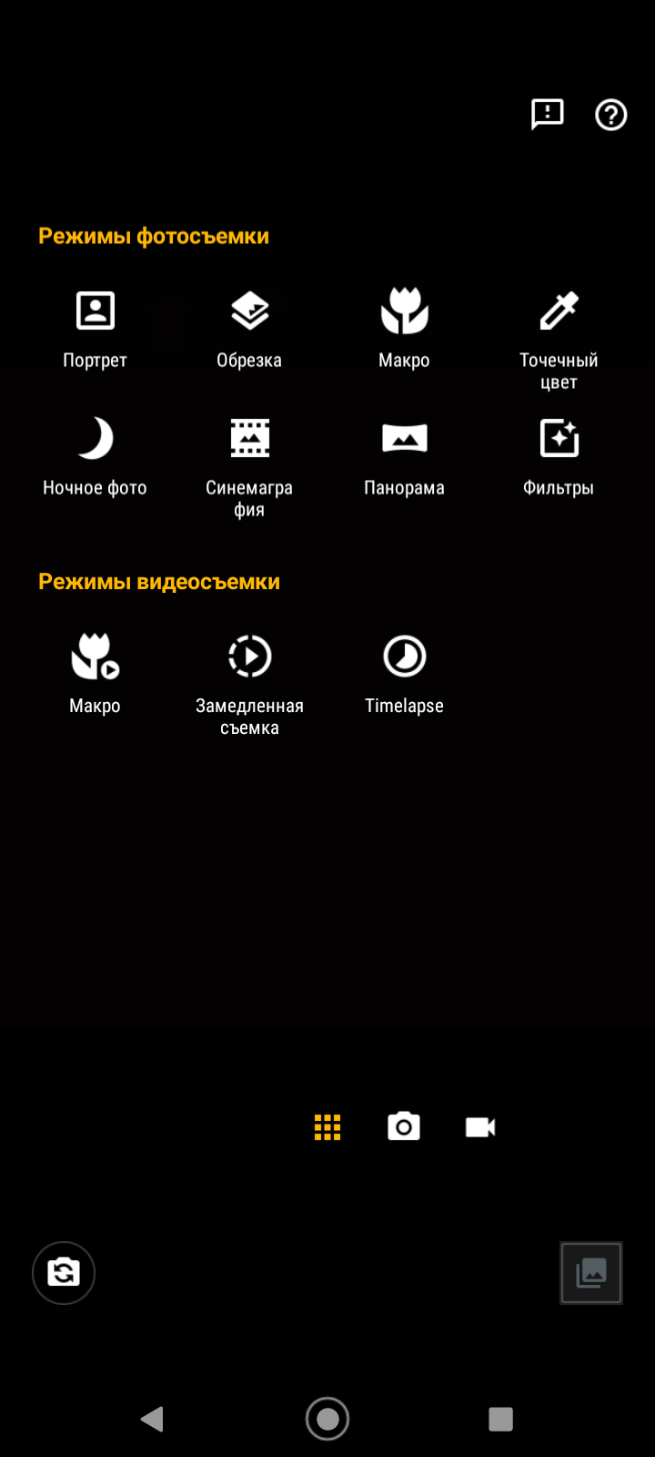В разделе дополнительных режимов можно найти ручной режим управления, замедленной и макросъемки, панорамный, удаление фона, а также распространенный эффект одного цвета (здесь это называется «Точечный цвет»). Есть режим Auto HDR, возможность накладывать цветовые фильтры и даже сохранять штатными средствами снимки в RAW (только в ручном режиме).