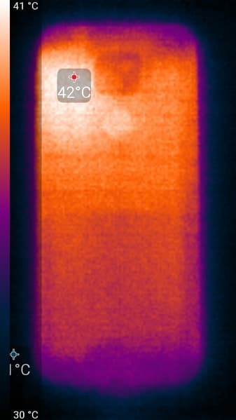 Нагрев больше в верхней правой части аппарата, что, видимо, соответствует расположению микросхемы SoC. По данным теплокамеры, максимальный нагрев составил 42 градуса (при температуре окружающего воздуха в 24 градуса). Такой нагрев нельзя назвать незначительным.