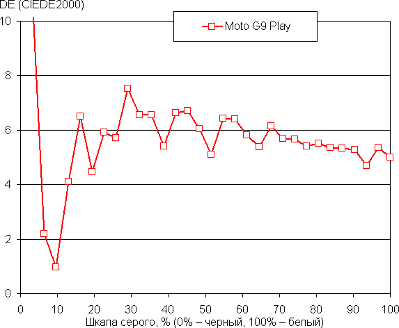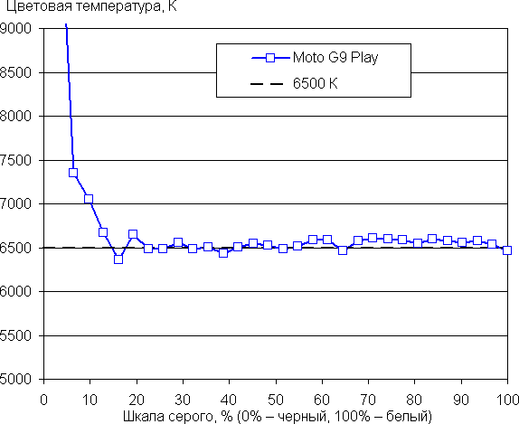В принципе, яркий свет может приводить к нарушению суточного (циркадного) ритма (см. статью про iPad Pro с дисплеем 9,7 дюйма), но все решается снижением яркости до комфортного уровня, а искажать цветовой баланс, уменьшая вклад синего, нет абсолютно никакого смысла. Впрочем, данную настройку можно использовать для коррекции цветового баланса, так как по умолчанию цветовая температура высоковата, порядка 7400 К. Результат после коррекции хороший (см. графики ниже, а положение ползунка — на изображении выше), поскольку цветовая температура становится близкой к стандартным 6500 К, а отклонение от спектра абсолютно черного тела (ΔE) ниже 10, что для потребительского устройства считается хорошим показателем. При этом цветовая температура и ΔE мало изменяются от оттенка к оттенку — это положительно сказывается на визуальной оценке цветового баланса. (Самые темные области шкалы серого можно не учитывать, так как там баланс цветов не имеет большого значения, да и погрешность измерений цветовых характеристик на низкой яркости большая.)
