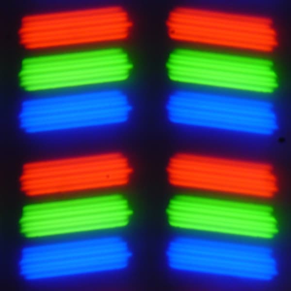 В данном смартфоне используется матрица типа IPS. Микрофотографии демонстрируют типичную для IPS структуру субпикселей: