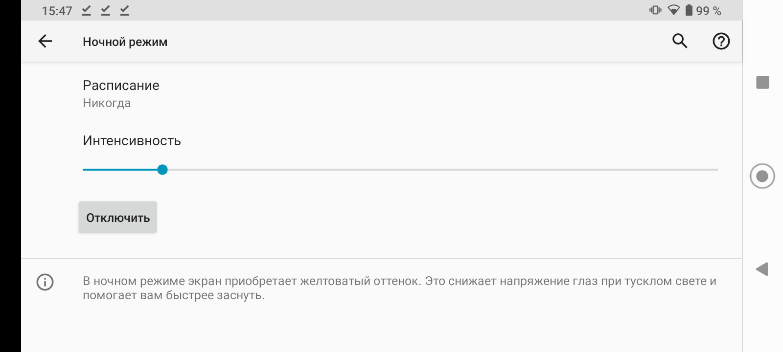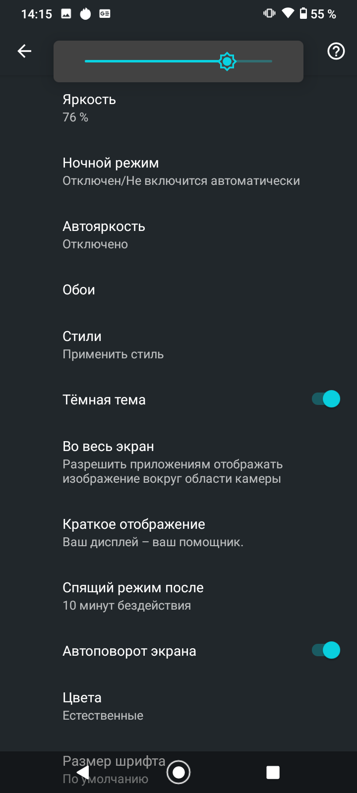 При ручном управлении яркостью и при выводе белого поля во весь экран максимальное значение яркости составило около 380 кд/м², минимальное — 2,8 кд/м². Максимальная яркость невысокая, но, учитывая отличные антибликовые свойства, что-то разглядеть на экране можно будет даже в солнечный день вне помещения. В полной темноте яркость можно понизить до комфортного значения. В наличии автоматическая регулировка яркости по датчику освещенности (он находится на фронтальной панели близко к верхнему краю правее решетки фронтального громкоговорителя). В автоматическом режиме при изменении внешних условий освещенности яркость экрана как повышается, так и понижается. Работа этой функции зависит от положения ползунка регулировки яркости: им пользователь может попытаться выставить желаемый уровень яркости в текущих условиях. Если не вмешиваться, то в полной темноте функция автояркости уменьшает яркость до 25 кд/м² (подходит), в условиях освещенного искусственным светом офиса (примерно 550 лк) устанавливает на 155 кд/м² (нормально), в очень ярком окружении (соответствует освещению ясным днем вне помещения, но без прямого солнечного света — 20000 лк или немного больше) повышает до 380 кд/м² (до максимума, так и нужно). Ради эксперимента мы немного уменьшили яркость в полной темноте и получили в полной темноте 15 кд/м², в условиях освещенного искусственным светом офиса 160 кд/м², в очень ярком окружении 380 кд/м². Примерно такие же значения получились и после циклов увеличения яркости внешнего освещения и снижения. Получается, что функция автоподстройки яркости работает адекватно и позволяет пользователю настраивать свою работу под индивидуальные требования. На любом уровне яркости значимая модуляция подсветки отсутствует, поэтому нет и никакого мерцания экрана.