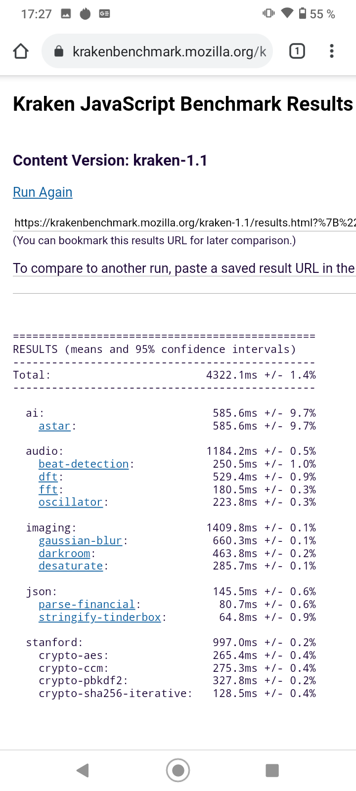| Mozilla Kraken (мс, меньше — лучше) | 4322 | 4450 | 5586 | 2921 | 3090 |