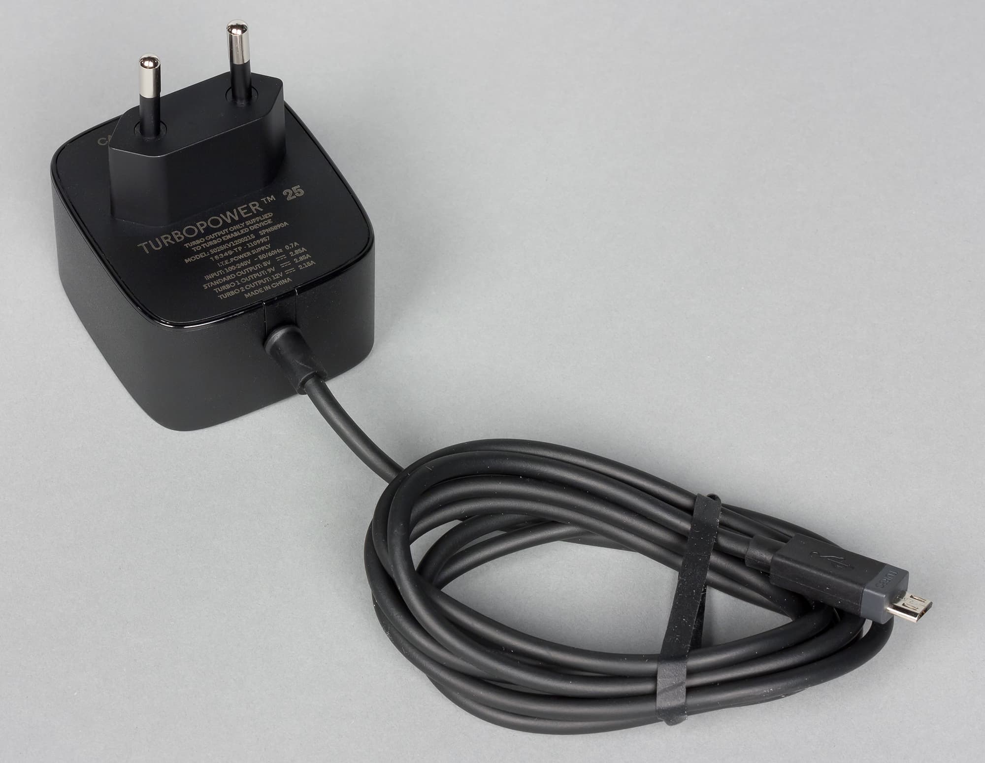 Зарядное устройство здесь не совсем обычное: в нем нет привычного USB-выхода, кабель к блоку припаян наглухо. Смартфон поддерживает ускоренную зарядку TurboPower, поэтому у комплектного ЗУ максимальный выходной ток составляет 12 В 2,15 А. Комплектное зарядное устройство достаточно массивное, компактным его не назвать, но именно его придется носить с собой, если хочется использовать функцию быстрой зарядки.