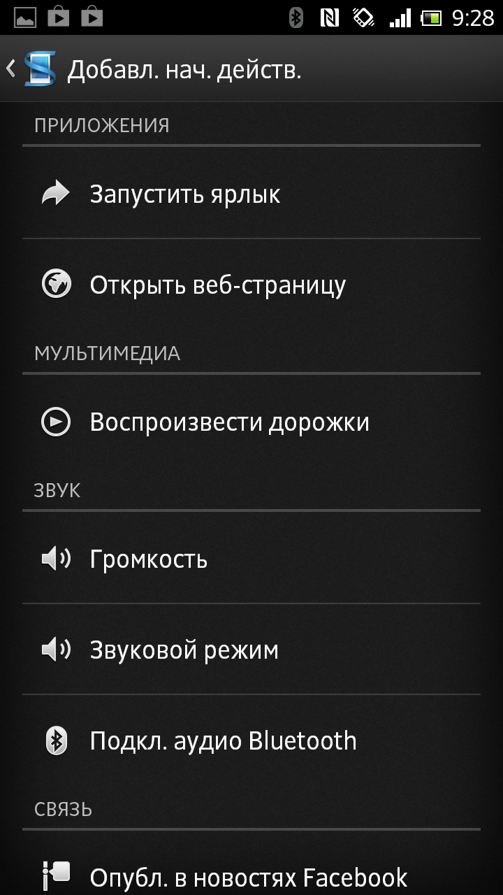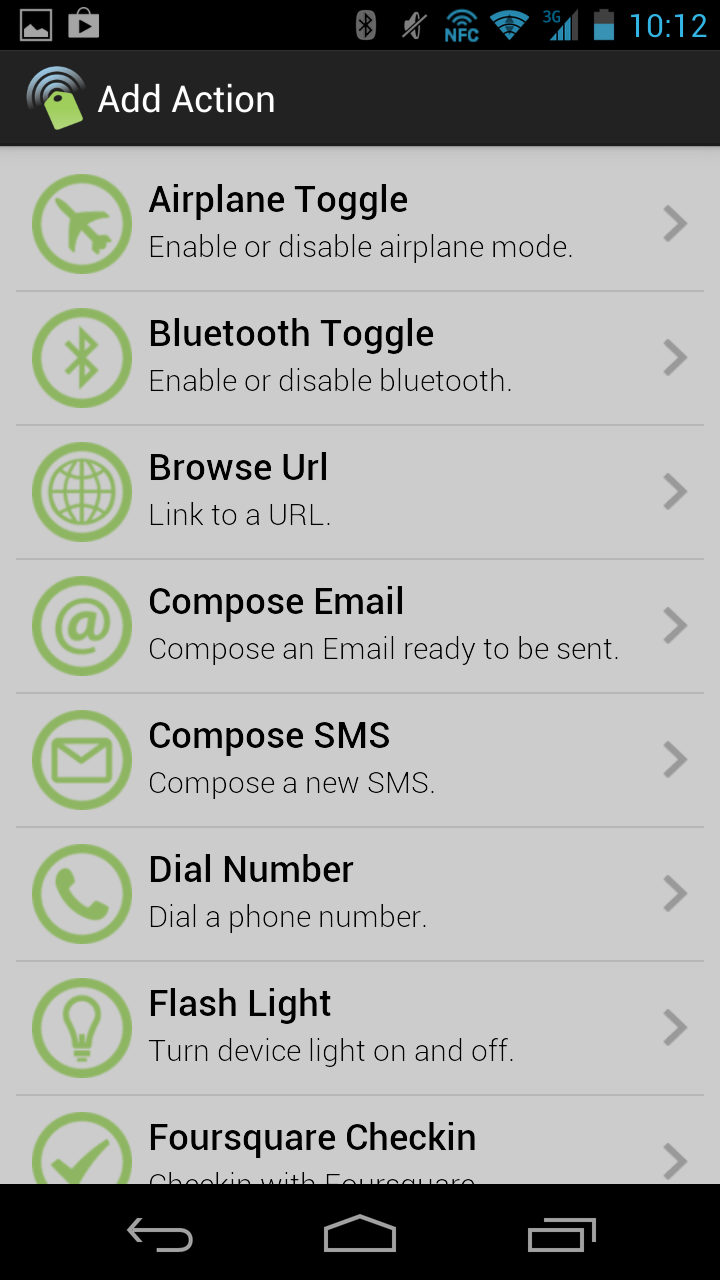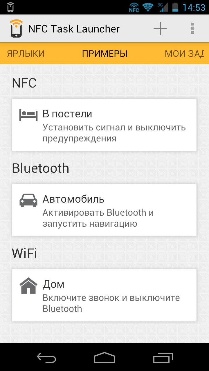 - NFC Task Launcher: кроме меток NFC может активировать настройки по подключению к Bluetooth или Wi-Fi, среди действий есть переключение режимов, интерфейсов, громкости и настроек экрана, публикации в социальных сетях, отправка e-mail и SMS, запуск приложений, открытие страниц в браузере, управление медиаплеером, настройка будильника, телефонный звонок.
