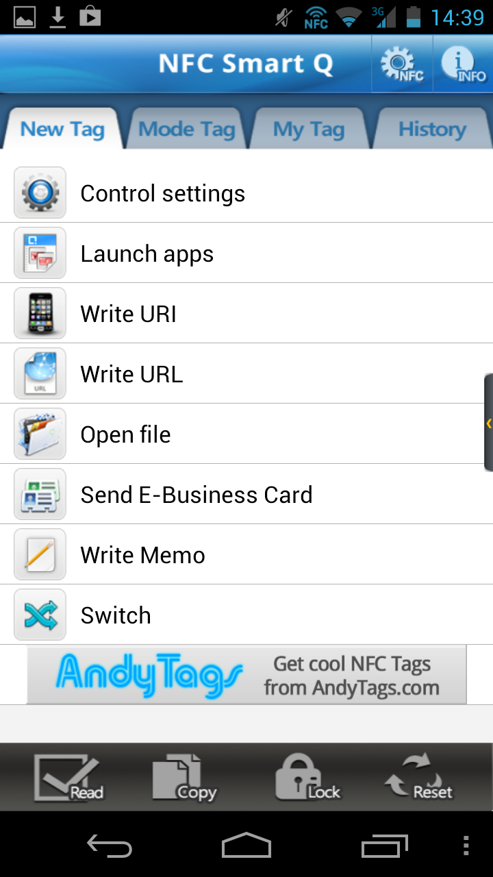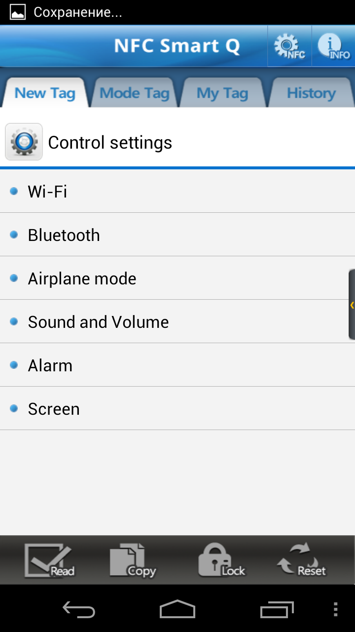 - NFC Smart Q: опции по настройке режимов телефона, запуску приложений, можно использовать несколько записей на одной метке, дополнительно создается короткая web-ссылка стандартного формата NDEF, которая позволяет на новом устройстве загрузить данную программу и использовать некоторые из опций;