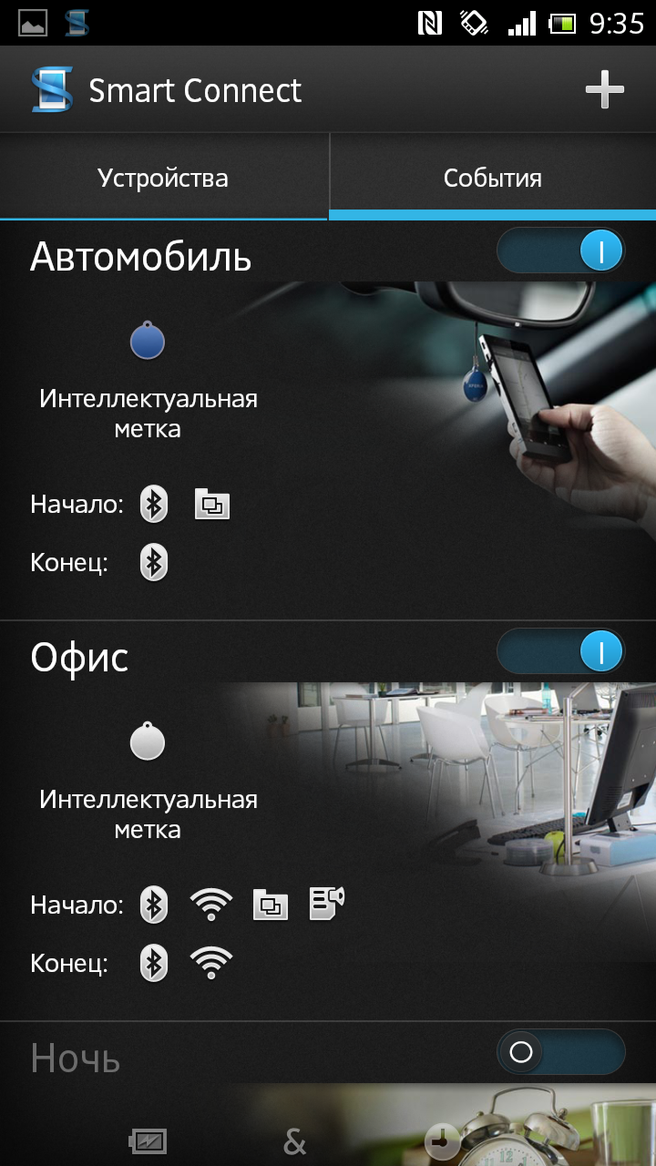 Сама программа Smart Connect работает не только с NFC-метками, но и с другими подключаемыми к телефону устройствами, включая гарнитуры, блок питания, устройства Bluetooth. Достаточно удобно, что штатные настройки уже неплохо соответствуют указанным выше сценариям. При этом пользователь может перепрограммировать все схемы; в каждой из них указывается набор из условия и действий.