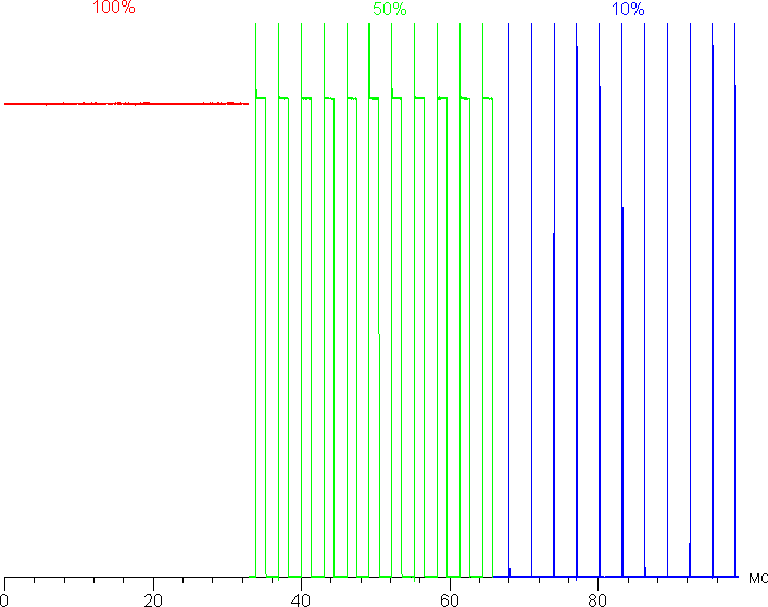 Экран хорошо выглядит только на картинке с коробки. Вживую он, после IPS-экранов даже в самых недорогих смартфонах, разочаровывает. Размер экран по современным меркам маловат, в корпусе таких габаритов хотелось бы диагональ минимум в 2,8 дюйма. Зачем-то используется внешнее защитное пластиковое стекло. Оно царапается не очень быстро, но все же царапается, и также создает воздушный промежуток между собой и собственно ЖК-матрицей. Этот промежуток очень сильно снижает антибликовые свойства экрана, что в совокупности с невысокой яркостью сильно осложняет использование телефона на улице солнечным днем. Максимальная яркость достигает всего 288 кд/м². Минимальное значение яркости — 9 кд/м². В полной темноте яркость можно понизить до комфортного значения. Яркость регулируется с помощью ШИМ с частотой 328 Гц. Глазами мерцания не видно, все-таки частота довольно высокая, но в тесте на стробоскопический эффект наличие модуляции выявляется. Графики зависимости яркости (вертикальная ось) от времени (горизонтальная ось) при различных значениях настройки яркости: