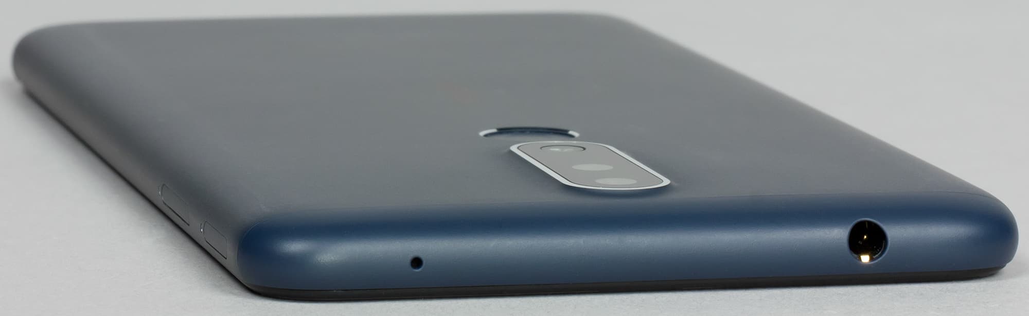 В нижнем торце USB представлен, к сожалению, не актуальным разъемом Type-C, как в Nokia 5.1 Plus, а несимметричным и медленным Micro-USB, и это несомненный минус. Сюда же, в нижний торец, выведен и громкоговоритель, причем зачем-то проделано два ряда отверстий, хотя динамик тут один. Если за вторым скрывается разговорный микрофон, то зачем ему целых пять отверстий?