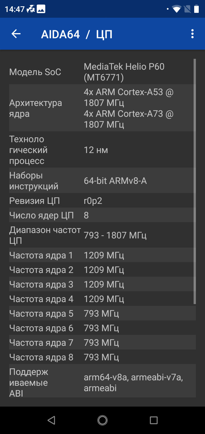 - SoC MediaTek Helio P60, 8 ядер (4×Cortex-A53 @1,8 ГГц + 4×Cortex-A73 @1,8 ГГц)