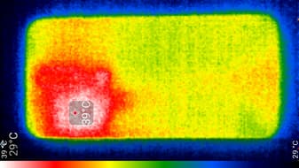 Нагрев локализован в верхней части аппарата ближе к правому краю, что, видимо, соответствует расположению микросхемы SoC. По данным теплокамеры, максимальный нагрев составил 39 градусов (при температуре окружающего воздуха в 24 градуса), это средний нагрев.