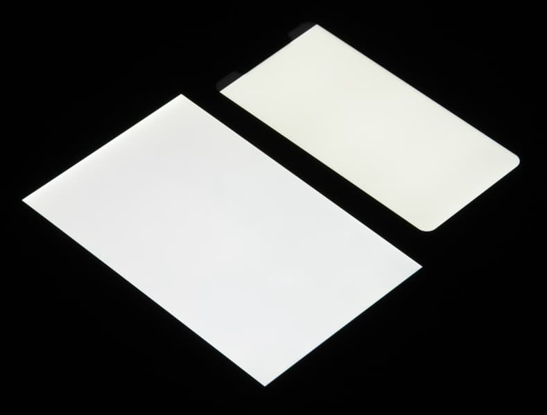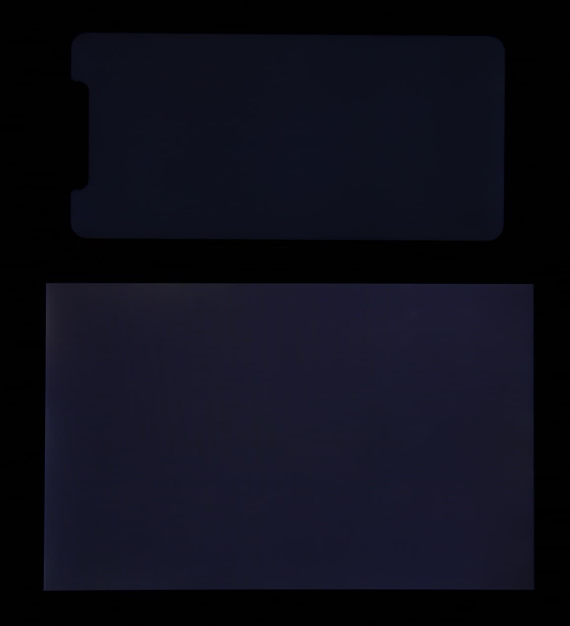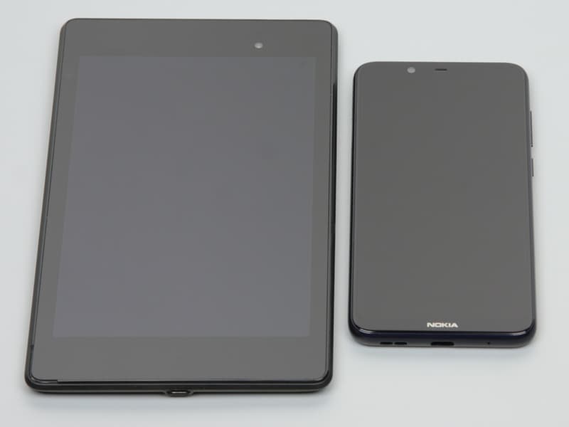 Лицевая поверхность экрана выполнена в виде стеклянной пластины с зеркально-гладкой поверхностью, устойчивой к появлению царапин. Судя по отражению объектов, антибликовые свойства экрана лучше, чем у экрана Google Nexus 7 (2013) (далее просто Nexus 7). Для наглядности приведем фотографию, на которой в выключенных экранах отражается белая поверхность (слева — Nexus 7, справа — Nokia 5.1 Plus, далее их можно различать по размеру):