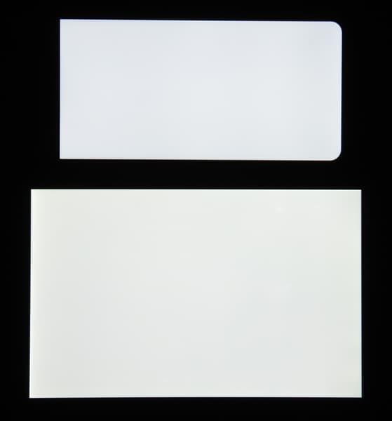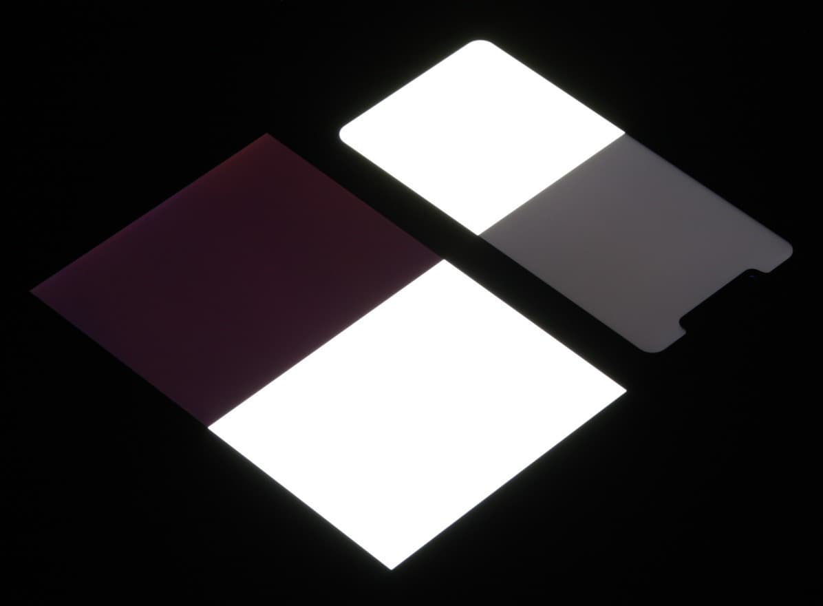 Черное поле при отклонении по диагонали сильно высветляется, но остается условно нейтрально-серым. Фотографии ниже это демонстрируют (яркость белых участков в перпендикулярном плоскости экранов направлении одинаковая!):